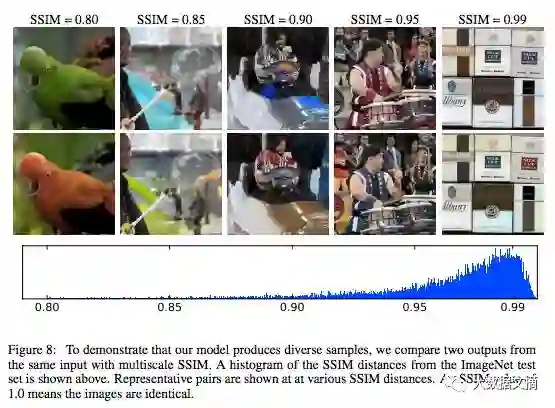 为证明我们的模型可生成不同的样本,我们用多尺度SSIM对比了同一输入的两种输出。上图显示了ImageNet测试数据集的SSIM距离直方图。图中在多个SSIM间距上分别显示了每对图像。SSIM值为1表示两张图像完全相同。