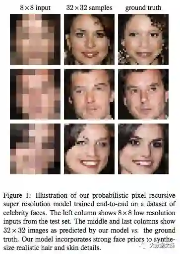 左侧为测试数据集所用的8x8低分辨率输入图像。中间为PixelCNN模型所输出的32x32高分辨率图像,右侧是原始的32x32分辨率图像。我们的模型优先整合脸部特征,而后去合成较为逼真的头发与皮肤方面的细节。