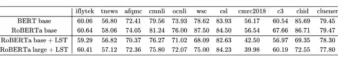 可以看到,实验结果没有原论文的英文实验那么乐观(当然不排除是笔者自己的实现不够好),但训练效率确实有明显提升(平均来说提升一倍左右)。整个实验下来,笔者的感觉是对于比较常规、一般难度的分类任务,LST 能取得相近的效果,但对于比较困难的任务,比如阅读理解等,LST 会有非常明显的下降。当然,其实应该不只是LST有这个问题,大部分号称参数高效的微调方法估计都有这个问题,因为这些方法的实验任务多数都只是 GLUE,GLUE 其实全都是相对简单的分类任务...