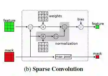 本文针对,利用稀疏的激光扫描数据进行深度重建,这样一个应用场景,研究稀疏输入的卷积神经网络。首先,在稀疏输入的情况下,即使将丢失的数据的位置信息提供给神经网络,传统的卷积神经网络效果也不好。为了解决这个问题,作者提出一种简单但是有效的稀疏卷积层。在卷积操作的过程中,稀疏卷积层准确的包含丢失的数据的位置信息。作者通过实验,在多个基准上验证了所提出了神经网络架构的优越性。为了进行评估,作者基于KITTI数据集,创建了一个新的数据集,原数据集包含94k张标注过的RGB图像。新创建的数据集可以在深度重建和深度预测时,用来对模型进行训练和测评,并且已经在网上开源,网址为: