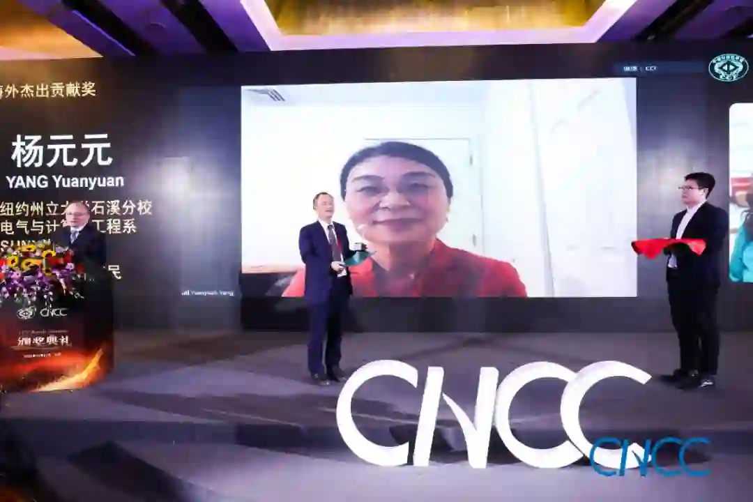 “CCF海外杰出贡献奖”设立于2005年,旨在奖励通过科学研究、学术交流、人才培养和国际合作,为推动中国的计算机事业发展做出了杰出贡献的海外(含港澳台)计算机专业人士。至今已有18位海外人士获此殊荣。因为疫情的特殊原因,杨元元教授通过远程连线的方式参加颁奖会进行领奖。该奖项首位得主香港中文大学(深圳)校长讲座教授黄铠,今年获邀做大会特邀报告,也同在现场见证这一时刻。