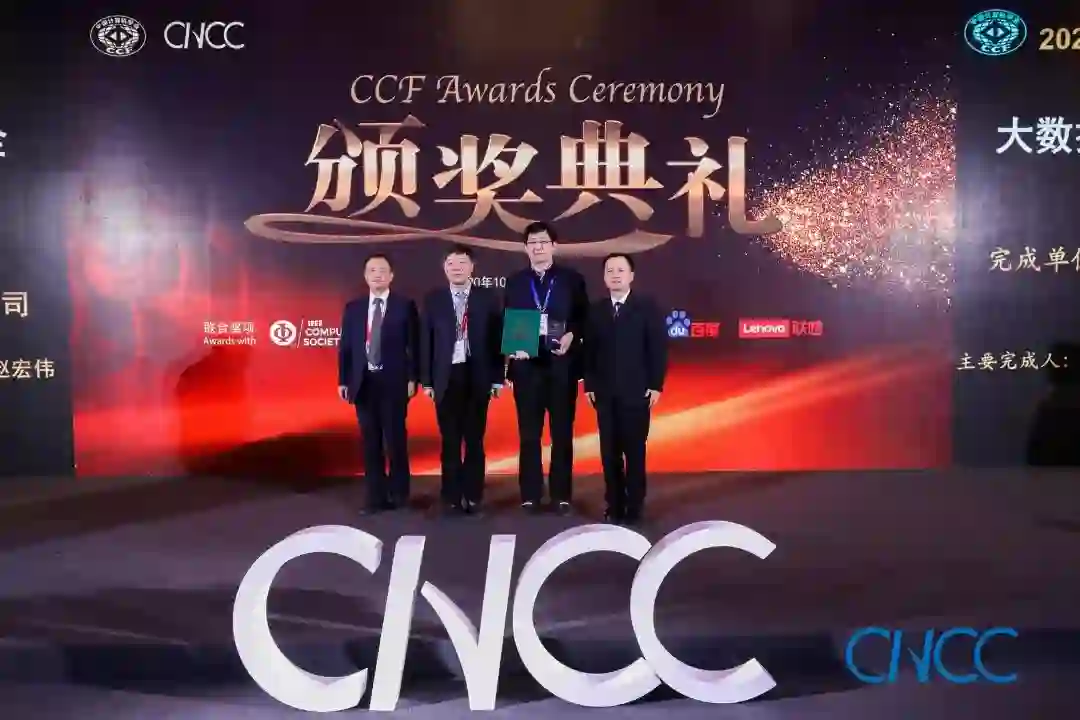 CCF理事长梅宏教授(左一)、CCF副理事长金海教授(左二)、胡事民教授(右一)为科技进步卓越奖获奖代表颁奖