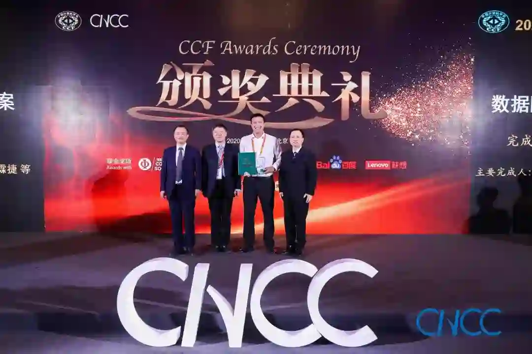 CCF理事长梅宏教授(左一)、百度校园品牌部总监李轩涯博士(右一)为郭得科教授颁奖