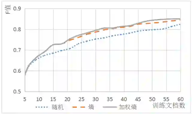 对照实验分别利用随机选择、基于熵、基于分布度对熵加权(权重)的选择策略选取训练数据,实验结果如图2所示,在选取的训练数据规模较小(<20)时,基于熵的传统模型与分布度对熵加权模型的评价结果基本相同,这说明二者选出的文档雷同,加权熵的权重没有发挥出作用。这是因为样本空间比较小,较长的文档数量有限,由于我们采用总熵的方式计算文档的评分,故二者均优先选出了样本中的长文档。