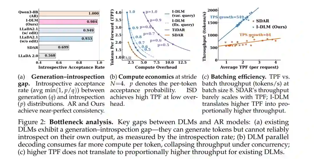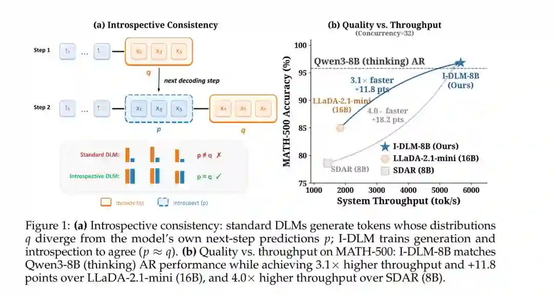 我们从算法与系统两个视角重新审视了这一问题。在算法层面,这种视角的转变促使我们重新检查 AR 建模核心中一个看似简单设计:因果掩码(Causal Masking)结合 Logit 平移(Logit Shifting)。除了实现下一 token 预测外,这种训练结构还隐式地教导模型在相同的预测规则下,重新审视并验证其先前生成的 token。实际上,AR 模型被训练为与其自身生成的内容保持一致,这暴露了现有 DLMs 的一个根本局限:尽管它们可以并行生成 token,但通常并未被训练为认可其自身的生成结果(例如,由于多步双向去噪机制的存在)。我们通过内省接受率(Introspective Acceptance Rate)这一概念将这一差距形式化,该指标用于衡量模型在内部接受其先前生成 token 的程度。我们发现,该属性可以作为衡量 DLM 与其自身生成内容保持一致程度的有效代理指标。 在系统层面,现有的 DLMs 往往针对激进的低延迟解码进行了优化,但这以显著增加计算开销为代价。虽然这种开销在内存受限(Memory-bound)场景下可以被部分掩盖,但在需要大批次推理的生产级部署中,系统会迅速进入计算受限(Compute-bound)状态。遗憾的是,目前的 LLM 服务栈与“多查询、多去噪”的模式匹配度较差。 主要贡献: 上述算法与系统间的失配促使我们协同设计了内省扩散语言模型(I-DLM)。这是一种既能保留 AR 内省一致性,又能维持并行特性的新范式。I-DLM 构建于“内省一致性训练”(一种将预训练 AR 模型高效转换为 DLM 的方案)以及一种新颖的内省步进解码(Introspective Strided Decoding, ISD)算法之上。ISD 在单次前向传播中生成 $N$ 个 token,同时根据因果锚点分布(Causal Anchor Distribution)验证先前的 token。我们证明,在训练期间显式强化内省一致性是弥合 DLM 与同规模强力 AR 模型之间质量差距的关键。本文的主要贡献如下: * 核心洞察: 指出内省一致性是先前 DLMs 中缺失的关键原理。我们证明扩散语言模型并未继承 AR 模型的内省一致性,即它们未被训练为认可自身的生成结果。这一属性的缺失从根本上限制了模型充分发挥其底层能力。 * 高质量并行生成的训练新范式: 引入了内省一致性训练,这是一种简单且高效的方案,可将预训练 AR 模型转换为内省 DLM(例如仅需 5B token)。通过显式强化内省一致性,该方法在不牺牲 AR 级质量的前提下实现了并行解码。与以往方法不同,它不需要蒸馏策略或掩码课程学习(Masking Curricula),为构建高质量 DLM 提供了一条稳定且高效的路径。 * 统一生成与验证的单次解码算法: 提出了内省步进解码(ISD),该算法在单次前向传播中同时生成新 token 并修订先前的 token。在 [MASK] 位置,模型提议新 token;在“内省”位置,模型根据其因果锚点分布重新审视先前的 token。这使得输出在证明上能匹配基础 AR 分布,且无需启发式置信度判断或独立的验证过程。 * AR 兼容的推理服务栈: 设计了一个直接兼容现有 AR 服务系统(如 SGLang)的推理栈。此外,我们开发了一套**门控残差适配(Gated Residual Adaptation)**机制,其中 LoRA 适配器仅应用于掩码位置,而验证过程则依赖基础模型权重。该机制支持从近乎无损到严格无损模式的连续切换。 * 全方位的性能验证: 在 15 个基准测试中,证明了 I-DLM 是首个能达到同规模强力 AR 质量的 DLM,同时在模型能力和实际服务效率上均大幅超越此前的 DLMs。我们的研究结果建立了新的“质量-效率”前沿。