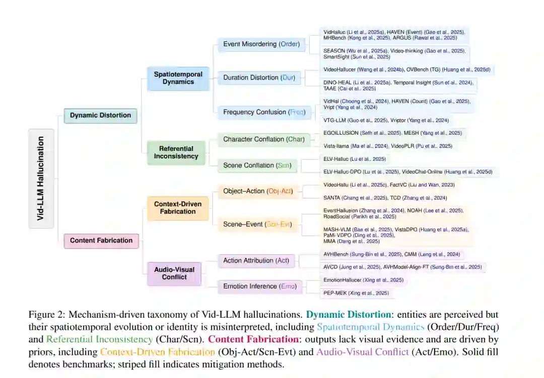 为了填补这一空白,本综述提出了一种针对视频特性且由机制驱动的分类体系,将幻觉分为两大主要类型:动态扭曲(Dynamic Distortion),即模型错误地表述了实体与场景的时空演变或引用一致性(Referential Consistency);以及内容编造(Content Fabrication),即输出受到先验知识的影响或被音频模态主导。基于该分类体系,我们回顾了 Vid-LLMs 幻觉评估与缓解方面的最新进展,重点关注核心基准测试、评价指标及干预策略。 动态扭曲包括时空动力学中的幻觉,例如事件顺序错误 (Li et al., 2025a; Wu et al., 2025a; Sun et al., 2025)、时长估计不准 (Wang et al., 2024b; Huang et al., 2025d; Sun et al., 2024) 和频率计数错误 (Gao et al., 2025; Choong et al., 2024);同时也包括引用不一致现象,即模型混淆了不同的角色 (Seth et al., 2025; Yang et al., 2025) 或场景 (Lu et al., 2025; Ma et al., 2024; Pu et al., 2025)。 内容编造则包括上下文驱动型幻觉,即常见的“物体-动作” (Chang et al., 2025; Li et al., 2025c) 或“场景-事件” (Bae et al., 2025; Zhang et al., 2024; Ding et al., 2025) 共现模式导致了无根据的推断;以及音视频冲突,即强势的听觉线索掩盖了视觉证据,导致幻觉动作 (Sung-Bin et al., 2025; Jung et al., 2025) 或情绪状态 (Xing et al., 2025) 的产生。 进一步分析揭示了动态扭曲与内容编造的底层机制。动态扭曲通常源于时序编码受限导致细粒度运动线索缺失 (Zhao et al., 2025; Liu et al., 2024b),并在长视频中因长期记忆不足 (Bae et al., 2025) 和时序定位(Temporal Localization)能力较差 (Wu et al., 2025a) 而进一步加剧。相比之下,内容编造源于视觉定位(Visual Grounding)不足 (Lee et al., 2025),导致预训练先验 (Li et al., 2025c) 或主导音频信号 (Leng et al., 2024) 覆盖了视觉证据。 鉴于这些潜在机制,极具前景的研究方向包括开发动作感知架构 (Wu et al., 2025b) 以保留细粒度时序特征,从而强化视觉感知与时序推理之间的对齐。此外,解离视觉证据与先验知识的反事实训练策略 (Huang et al., 2025c) 为缓解内容编造提供了一种原则性方法,鼓励模型更忠实地基于视觉输入进行预测。 与现有综述的比较。 幻觉问题在 LLM 和基于图像的 VLM 中已得到深入研究 (Zhang et al., 2023c; Huang et al., 2025b; Liu et al., 2024a; Lan et al., 2024)。虽然部分多模态大模型(MLLM)幻觉综述 (Sahoo et al., 2024; Bai et al., 2024) 在提及其他模态时涉及了视频,但其对视频幻觉的讨论仍停留在表面,仅简要提及基准测试和缓解策略,缺乏结构性或因果性分析。相比之下,本综述首次提出了由机制驱动的 Vid-LLMs 幻觉分类体系。我们提出了一个分层分类框架(图 2),对现有文献进行了更广泛、更详尽的综述,并分析了幻觉的底层诱因。基于此分析,我们勾勒了与诱因分析、基准覆盖和缓解策略紧密结合的未来方向,为构建抗幻觉的 Vid-LLMs 提供了连贯的路线图。 如第 2 节所述,视频的时序性与多模态特性带来了超越静态图像设置的挑战。为应对这些挑战,我们提出了一种由机制驱动的视频特有动态级幻觉分类体系。该体系依据可观察到的失效模式(Failure Modes)而非输入属性(如音频、长度或体裁)进行分类;我们将后者视为影响幻觉严重程度的调节因子。 这种设计基于以下观察:相似的失效模式(如动态关系错误或先验驱动的内容补全)会跨越不同的输入设置而出现;如果将输入属性作为主要分类轴,将会把结构上相同的失效模式割裂开来,从而阻碍不同设置间的可比性。本分类体系精准捕捉了时序推理与跨模态对齐中的失效,并将幻觉归纳为动态扭曲(Dynamic Distortion)与内容编造(Content Fabrication),每一大类下各设两个子类及代表性案例(见图 2)。该体系为后续的评估与针对性缓解策略(详见第 4 节与第 5 节)提供了统一的基础。