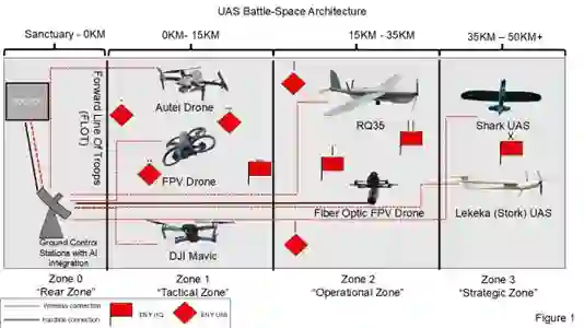 图1:乌克兰无人机作战空间所有三个区域的无人航空系统架构示例,按区域和与战术作战中心/联合作战中心的连接媒介列出资产,由彼得森上尉和乌军特战军官绘制