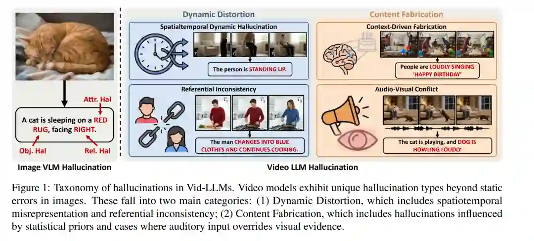 尽管视频-语言建模已取得显著进展,但幻觉问题仍是视频大语言模型(Vid-LLMs)面临的持久挑战。幻觉是指模型输出内容看似合理,实则与输入视频内容相矛盾的现象。本综述对 Vid-LLMs 中的幻觉现象进行了全面分析,并提出了一种系统性的分类体系,将其归纳为两大核心类型:动态扭曲(Dynamic Distortion)与内容编造(Content Fabrication),且每类下均包含两个子类及代表性案例。 基于该分类体系,我们回顾了幻觉评估与缓解方面的最新进展,涵盖了核心基准测试、评价指标及干预策略。我们进一步分析了动态扭曲与内容编造的根源,指出其通常源于时序表征能力受限以及视觉定位(Visual Grounding)不足。基于上述见解,本文提出了若干极具前景的未来研究方向,包括开发动作感知视觉编码器以及集成反事实学习技术。本综述通过整合分散的研究进展,旨在促进对 Vid-LLMs 幻觉问题的系统性理解,为构建稳健且可靠的视频-语言系统奠定基础。