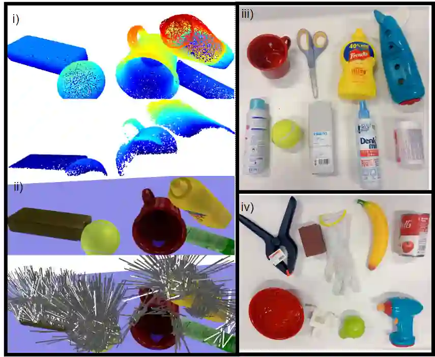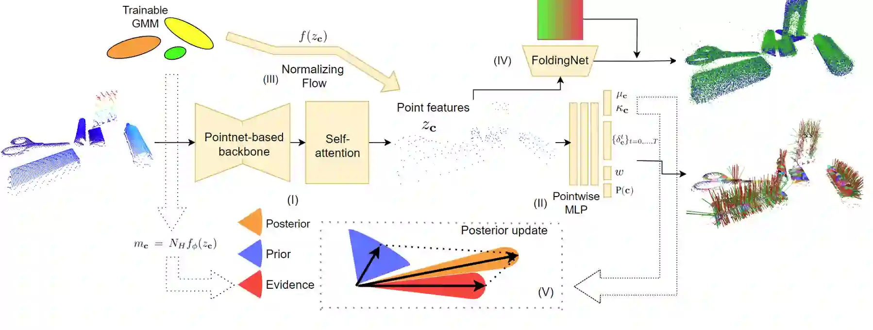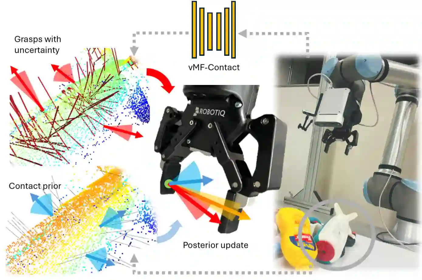 翻译:在存在遮挡、传感器噪声以及分布外(OOD)物体等噪声环境中进行抓取学习,面临着重大挑战。当前基于学习的方法主要侧重于从固有的数据噪声中捕捉偶然不确定性。而表征OOD识别的认知不确定性,通常通过具有多个前向路径的集成方法来解决,这限制了实时应用。本文提出一种不确定性感知方法,用于6自由度抓取检测,该方法利用证据学习来全面捕捉现实世界机器人抓取中的两种不确定性。作为核心贡献,我们提出了vMF-Contact,这是一种新颖的架构,用于学习分层接触抓取表示,并将方向不确定性以冯·米塞斯-费舍尔(vMF)分布的形式进行概率建模。为此,我们推导并分析了后验参数化二阶目标的理论公式,为模型量化不确定性和提升抓取预测性能提供了形式化保证。此外,我们通过将部分点云重建作为辅助任务来增强特征表达能力,从而提升了对不确定性量化的理解以及对未见物体的泛化能力。在真实世界实验中,与基线方法相比,我们的方法在总体清空率上实现了39%的显著提升。视频见 https://www.youtube.com/watch?v=4aQsrDgdV8Y&t=12s
