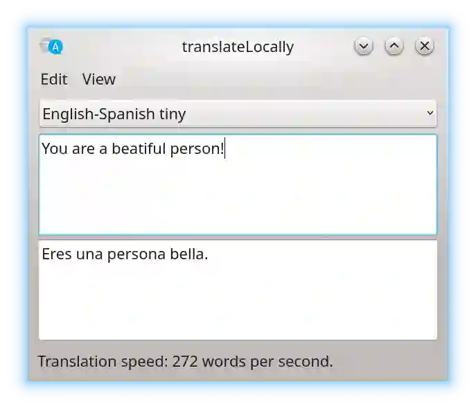 翻译:每天,数百万人牺牲自己的隐私和浏览习惯来换取在线机器翻译。 具有保密要求的公司和政府往往禁止在线翻译或支付额外费用以禁用伐木。 为了将控制权带回终端用户并展示速度,我们开发了本地翻译。 本地在台式或膝上型计算机的CPU上运行,即使用10年的硬件也翻译本地提供类似云的翻译速度和质量。 开放源软件以Marian为基础,运行在Linux、Windows和 MacOS上。
