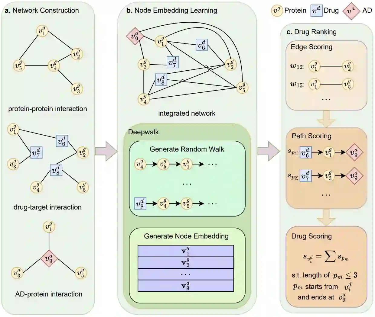 Recently, drug repurposing has emerged as an effective and resource-efficient paradigm for AD drug discovery. Among various methods for drug repurposing, network-based methods have shown promising results as they are capable of leveraging complex networks that integrate multiple interaction types, such as protein-protein interactions, to more effectively identify candidate drugs. However, existing approaches typically assume paths of the same length in the network have equal importance in identifying the therapeutic effect of drugs. Other domains have found that same length paths do not necessarily have the same importance. Thus, relying on this assumption may be deleterious to drug repurposing attempts. In this work, we propose MPI (Modeling Path Importance), a novel network-based method for AD drug repurposing. MPI is unique in that it prioritizes important paths via learned node embeddings, which can effectively capture a network's rich structural information. Thus, leveraging learned embeddings allows MPI to effectively differentiate the importance among paths. We evaluate MPI against a commonly used baseline method that identifies anti-AD drug candidates primarily based on the shortest paths between drugs and AD in the network. We observe that among the top-50 ranked drugs, MPI prioritizes 20.0% more drugs with anti-AD evidence compared to the baseline. Finally, Cox proportional-hazard models produced from insurance claims data aid us in identifying the use of etodolac, nicotine, and BBB-crossing ACE-INHs as having a reduced risk of AD, suggesting such drugs may be viable candidates for repurposing and should be explored further in future studies.