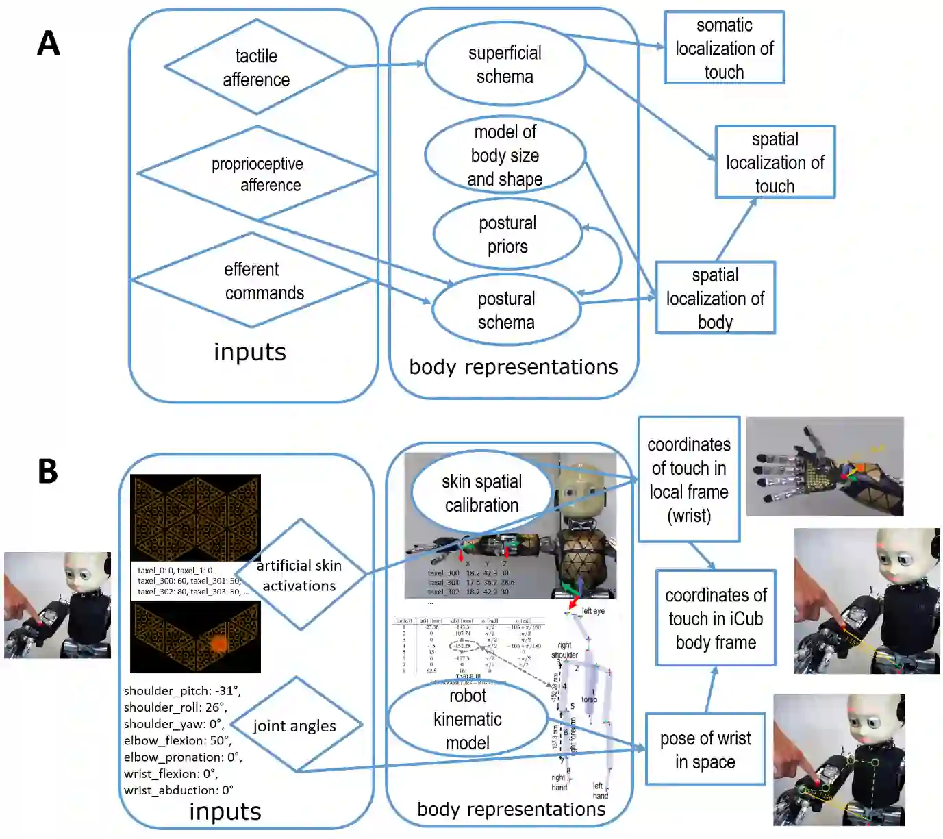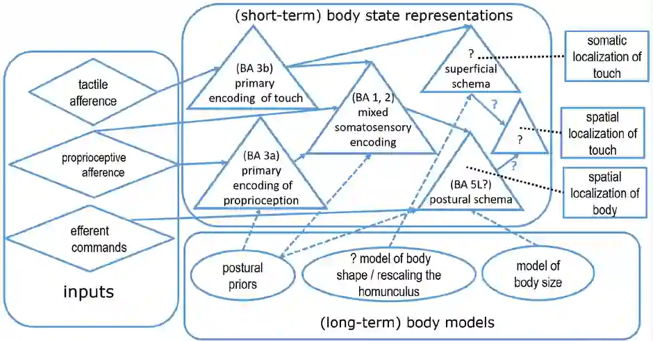 翻译:高层次血清处理的内分泌模型强调了储存体表在解释来自人体的实时感官信号方面所起的作用(Longo、Azaron和Haggard,2010年;Tame、Azaron和Longo,2019年)。这种储存体表征之所以有必要,是因为来自身体的即时感官信号没有具体说明关于身体大小和形状的计量细节。因此,Somataception的一些方面要求将即时感官信号与储存体积显示结合起来。对于人体机器人来说,这一基本问题也同样如此,令人不解的是,为解释人体感官信号而开发的神经感官理论模型与为将人体机器人接触本地化而独立开发的模型非常相似,例如iCub,其大部分身体表面(Roncone等人,2014年;Hoffmann,2021年)。在本章中,我们将审查这些模型的关键特征,讨论它们彼此的相似性和差异,以及文献中的其他模型。使用机器人作为计算计算模型, 也通过合成法研究其他的自我分析方法, 将这种模型进行。