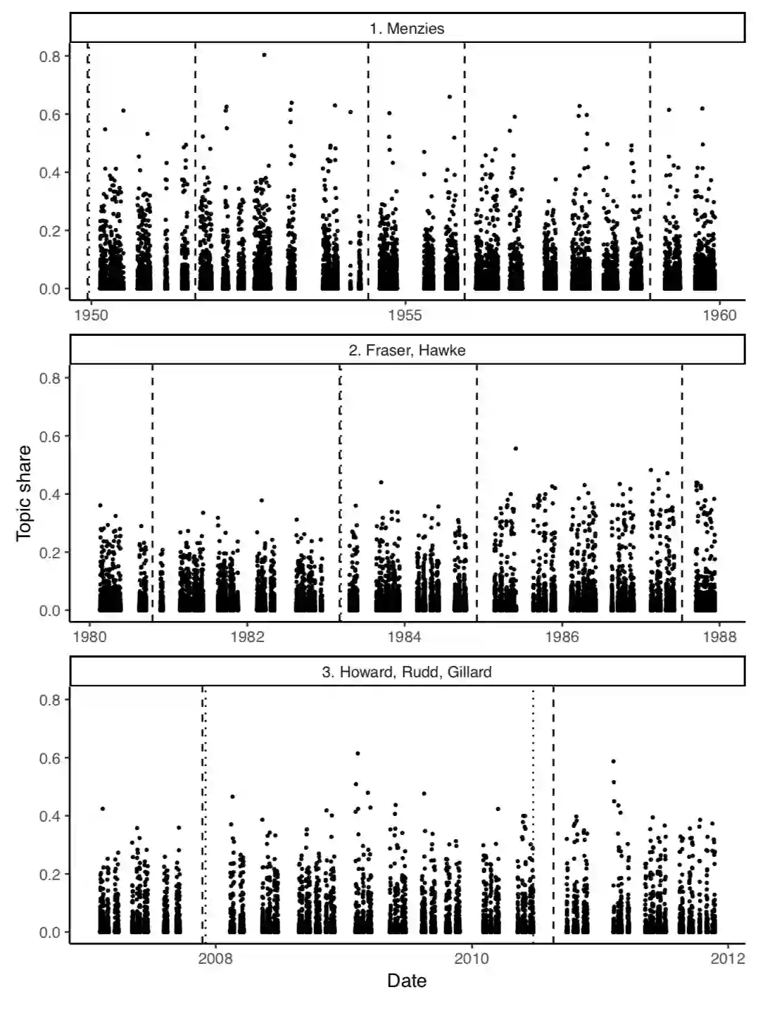 翻译:议会的政治和讨论很可能受到执政党及相关选举周期的影响。然而,对于这些事件在多大程度上影响到讨论,以及这种变化如何随时间推移而变化,我们鲜为人知。我们系统地分析澳大利亚联邦议会的讨论如何因两种类型的政治事件而发生变化:选举和更换总理。我们使用1901年至2018年澳大利亚联邦议会根据抽取和清理现有公共记录而新建的一组数据来说明其言论。我们使用一个相关主题模型来获取一套可比议题,从而减少了该数据集的讨论的广度。我们然后将这些议题与比较议程项目联系起来,然后使用巴伊西亚等级的Dirichlet模式来分析这两类事件的影响。我们发现:总理的变动往往与主题变化有关,即使当掌权的政党没有改变;选举的效果自1980年代以来一直在增加,无论选举结果是否导致总理的更替。