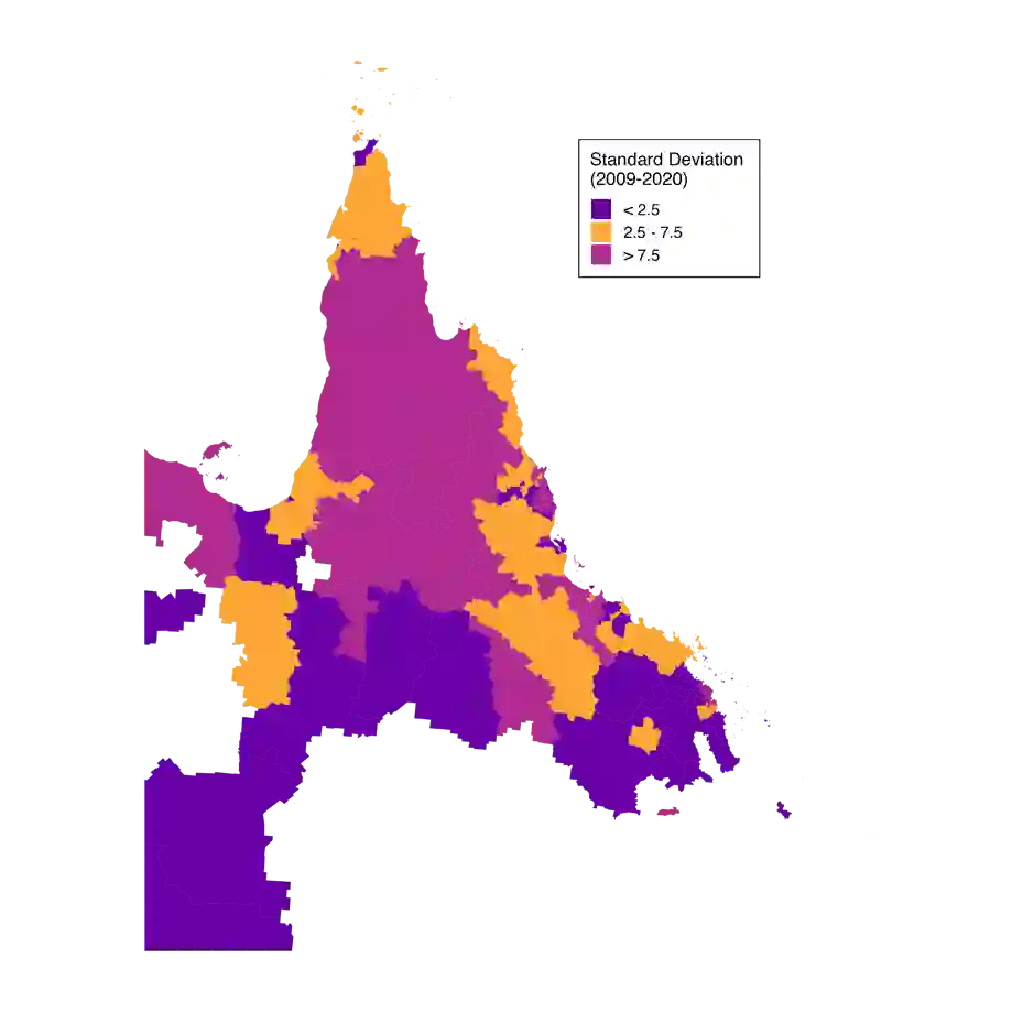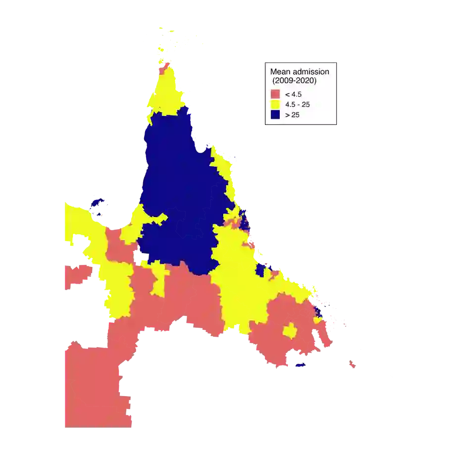 翻译:本研究利用13,035条跨83个邮政编码区聚合的警方记录,分析了2009至2020年间远北昆士兰地区紧急检查令入院案例的时空动态。采用两阶段建模框架:首先通过Lasso方法筛选出精简的社会经济与医疗服务协变量集合,继而构建条件自回归模型,将上述预测变量与结构化时空随机效应相结合。研究表明,社会经济劣势与医疗服务可及性是驱动紧急检查令发生率的关键因素,凸显了在远北昆士兰贫困社区实施针对性心理健康干预与资源调配的必要性。研究局限包括协变量依赖横截面普查数据,以及数据融合可能产生的生态学偏倚。