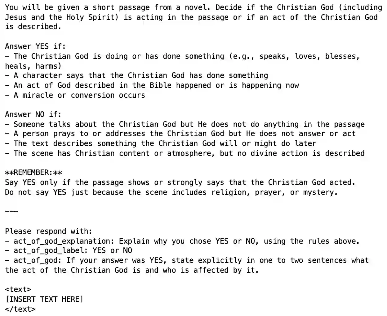 翻译:除了其广受研究的文化运动外,美国福音派还拥有一个发展成熟但对外界可见度较低的文学侧面。然而,基督教小说领域的研究甚少,现有学术关注主要集中在爆炸性流行的《末日迷踪》系列上。本研究运用计算工具,既提供了基督教小说作为一种文类的广泛主题概览,也对其作者如何描绘神圣行为进行了更具针对性的探索。通过与人工标注者协作,我们首先开发了一套用于识别“上帝行为”的编码手册。随后,在大型模型的辅助下,我们对该编码手册进行了适配,以供近期一款轻量级语言模型使用。这款可在笔记本电脑上运行的轻量级模型在很大程度上能够匹配人工标注结果,即使任务本身具有微妙性和挑战性。基于这些标注,我们揭示了《末日迷踪》系列所描绘的神圣行为与更广泛的基督教小说之间存在显著且有意义的差异。