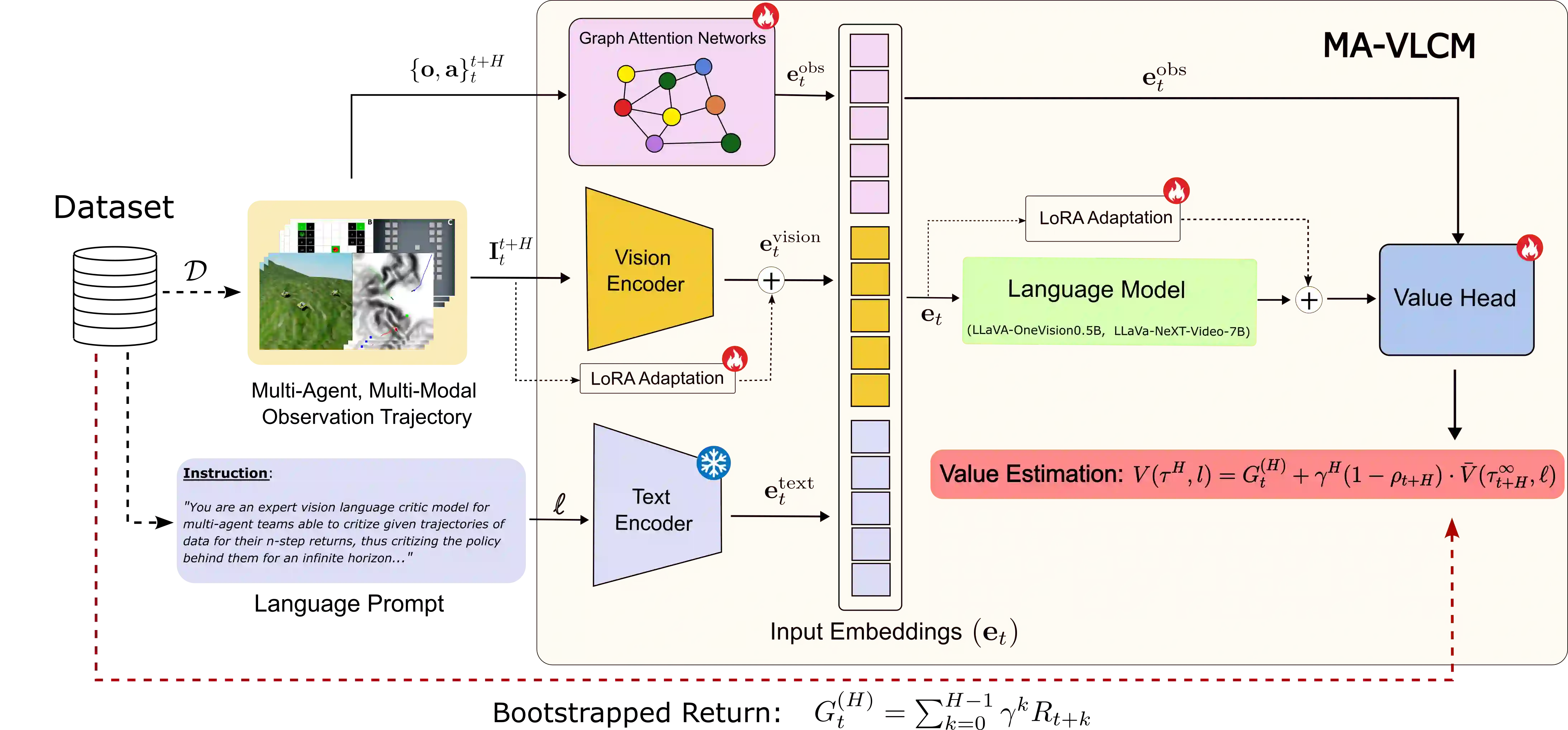 Multi-agent reinforcement learning (MARL) commonly relies on a centralized critic to estimate the value function. However, learning such a critic from scratch is highly sample-inefficient and often lacks generalization across environments. At the same time, large vision-language-action models (VLAs) trained on internet-scale data exhibit strong multimodal reasoning and zero-shot generalization capabilities, yet directly deploying them for robotic execution remains computationally prohibitive, particularly in heterogeneous multi-robot systems with diverse embodiments and resource constraints. To address these challenges, we propose Multi-Agent Vision-Language-Critic Models (MA-VLCM), a framework that replaces the learned centralized critic in MARL with a pretrained vision-language model fine-tuned to evaluate multi-agent behavior. MA-VLCM acts as a centralized critic conditioned on natural language task descriptions, visual trajectory observations, and structured multi-agent state information. By eliminating critic learning during policy optimization, our approach significantly improves sample efficiency while producing compact execution policies suitable for deployment on resource-constrained robots. Results show good zero-shot return estimation on models with differing VLM backbones on in-distribution and out-of-distribution scenarios in multi-agent team settings