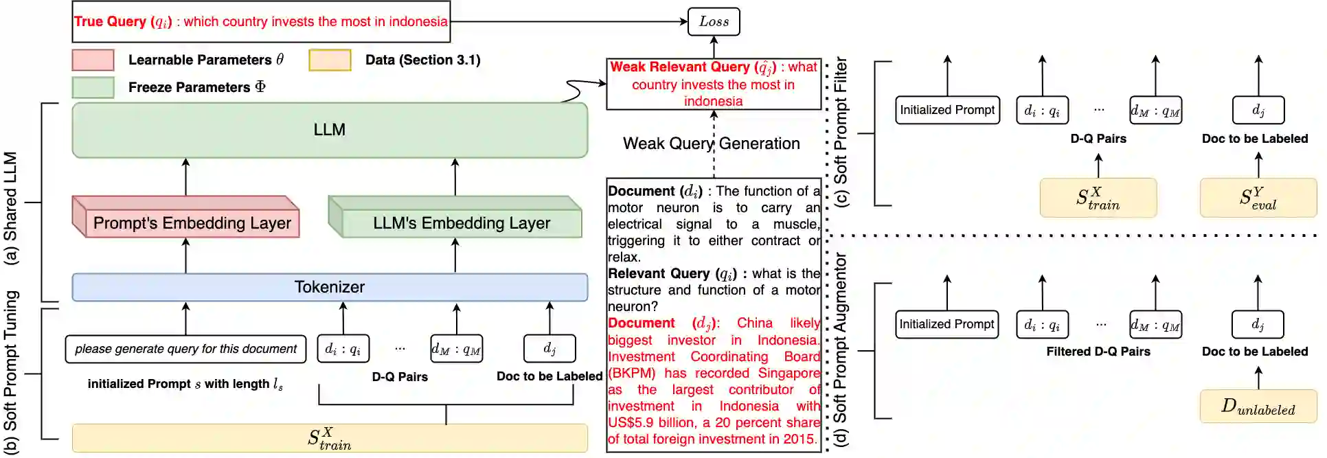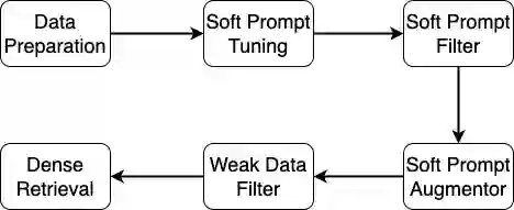 Dense retrieval (DR) converts queries and documents into dense embeddings and measures the similarity between queries and documents in vector space. One of the challenges in DR is the lack of domain-specific training data. While DR models can learn from large-scale public datasets like MS MARCO through transfer learning, evidence shows that not all DR models and domains can benefit from transfer learning equally. Recently, some researchers have resorted to large language models (LLMs) to improve the zero-shot and few-shot DR models. However, the hard prompts or human-written prompts utilized in these works cannot guarantee the good quality of generated weak queries. To tackle this, we propose soft prompt tuning for augmenting DR (SPTAR): For each task, we leverage soft prompt-tuning to optimize a task-specific soft prompt on limited ground truth data and then prompt the LLMs to tag unlabeled documents with weak queries, yielding enough weak document-query pairs to train task-specific dense retrievers. We design a filter to select high-quality example document-query pairs in the prompt to further improve the quality of weak tagged queries. To the best of our knowledge, there is no prior work utilizing soft prompt tuning to augment DR models. The experiments demonstrate that SPTAR outperforms the unsupervised baselines BM25 and the recently proposed LLMs-based augmentation method for DR.