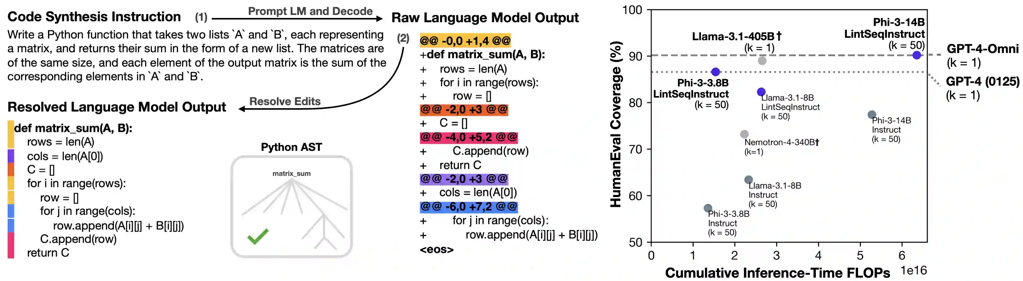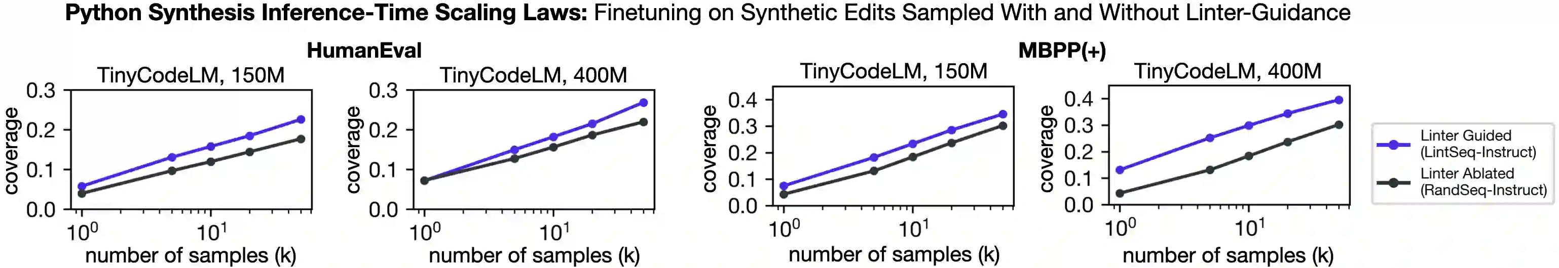 翻译:软件工程师主要通过编辑现有程序来编写代码。相比之下,大型语言模型(LLMs)以自回归方式单次合成程序。造成这种差异的一个原因是开源编辑数据的稀缺性。虽然高质量的代码合成指令数据已然匮乏,但高质量的编辑数据更为稀缺。为填补这一空白,我们开发了一种名为LintSeq的合成数据生成算法。该算法通过使用代码检查工具对无错误插入操作进行程序化采样,将现有代码重构为一系列代码编辑序列,从而逐步生成程序。算法以文本字符串形式输出编辑序列,这些字符串由连续的程序差异(diff)组成。为验证LintSeq,我们使用它将一组“指令+程序”对数据集重构为“指令+程序差异序列”元组。随后,我们在该数据集的重构版本和原始版本上,对一系列参数规模从26亿到140亿不等的较小LLMs进行指令微调,并比较它们在代码合成基准测试上的零样本性能。实验表明,在重复采样过程中,经过编辑序列微调的模型比基线模型能生成更多样化的程序。这带来了更好的推理时扩展性——即基准覆盖率随样本数量(“k”次尝试中任意尝试成功解决问题的比例“pass@k”)变化的函数关系。例如,在HumanEval的pass@50测试中,基于合成编辑序列微调的小型LLMs与GPT-4性能相当,且绝对分数比基于基线数据集微调的模型高出+20%(±3%)。最后,我们还预训练了用于代码理解的微型语言模型。实验证明,在合成代码编辑序列上微调微型模型,可为设备端模型类别带来最先进的代码合成性能。我们的1.5亿参数编辑序列语言模型在有无重复采样的条件下,均达到或超越了参数规模两倍于自身的代码模型性能,包括Codex和AlphaCode。