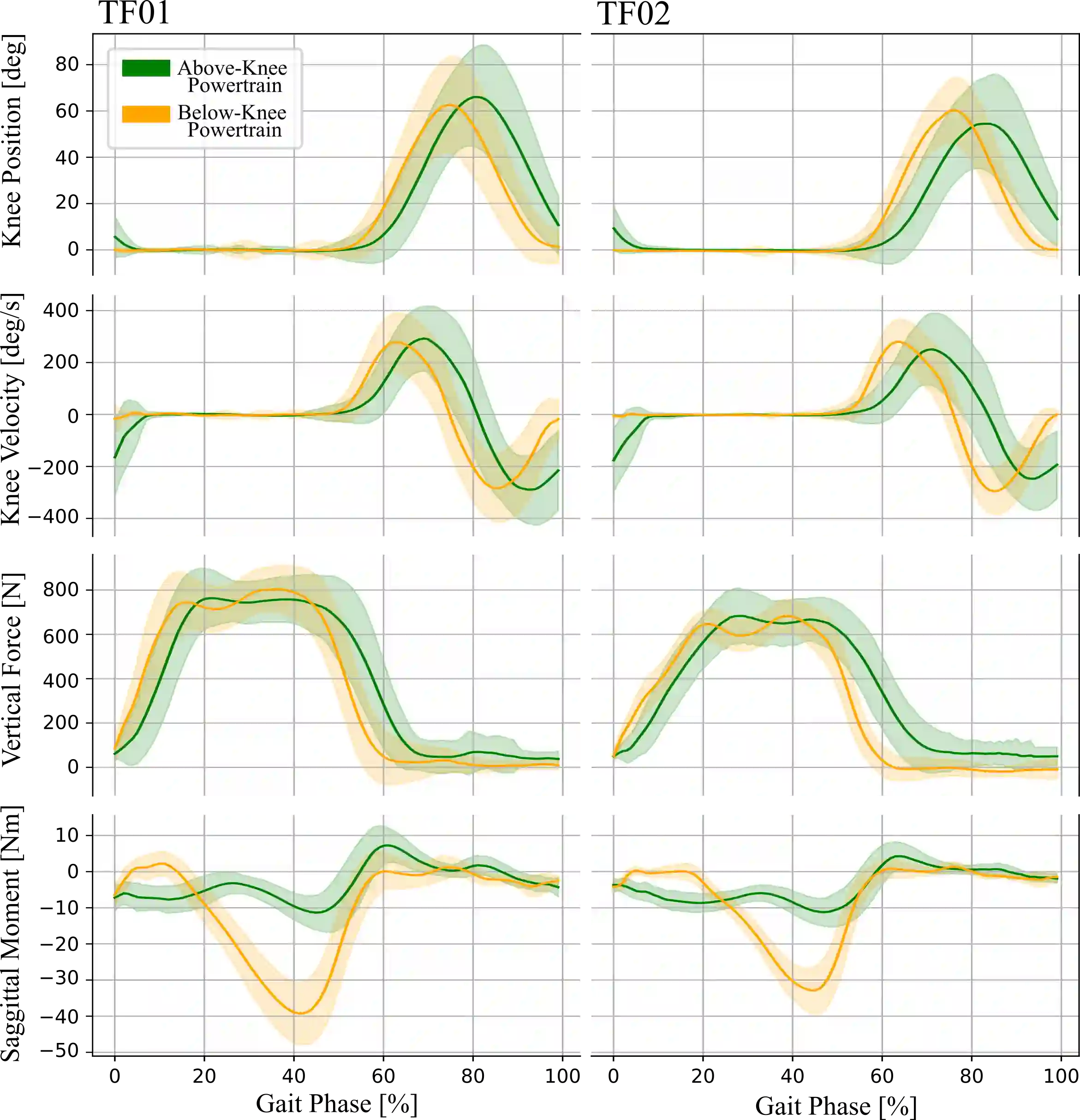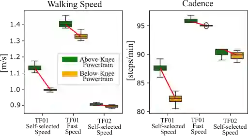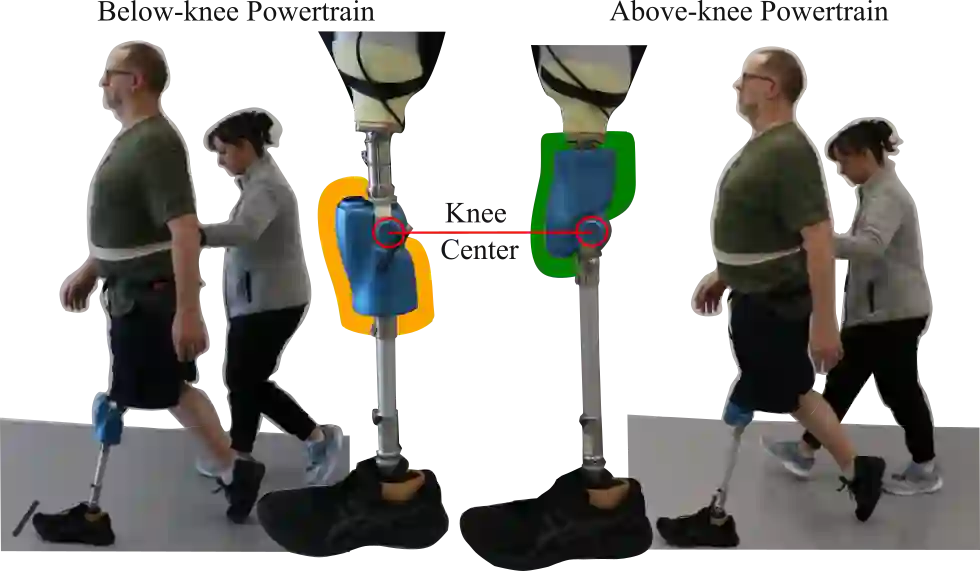 翻译:下肢截肢影响着全球数百万人,导致行动能力受损、步行速度下降以及日常和社交活动参与受限。动力式假肢膝关节通过主动辅助膝关节扭矩,可部分恢复行动能力,改善步态对称性、坐站转换和步行速度。然而,动力部件增加的质量可能削弱这些益处,对步态力学产生负面影响并增加代谢消耗。因此,优化质量分布而非单纯最小化总质量,可能提供更有效且实用的解决方案。在这项探索性研究中,我们评估了动力式假肢膝关节的膝上动力总成安置方案在小规模队列中的可行性。与膝下安置相比,膝上配置显示出更优的步行速度(一名参与者提升9.2%)和步频(提升3.6%),但对步态对称性的影响存在差异。运动学测量表明两种配置的膝关节活动范围和峰值速度相似。在斜坡和楼梯上的额外测试证实了控制策略在多种运动任务中的鲁棒性。这些初步发现表明膝上安置具有功能可行性,且精细的质量分布能在保留动力辅助优势的同时,缓解附加重量的不利影响。需进一步研究以确认这些趋势,并为设计与临床建议提供指导。