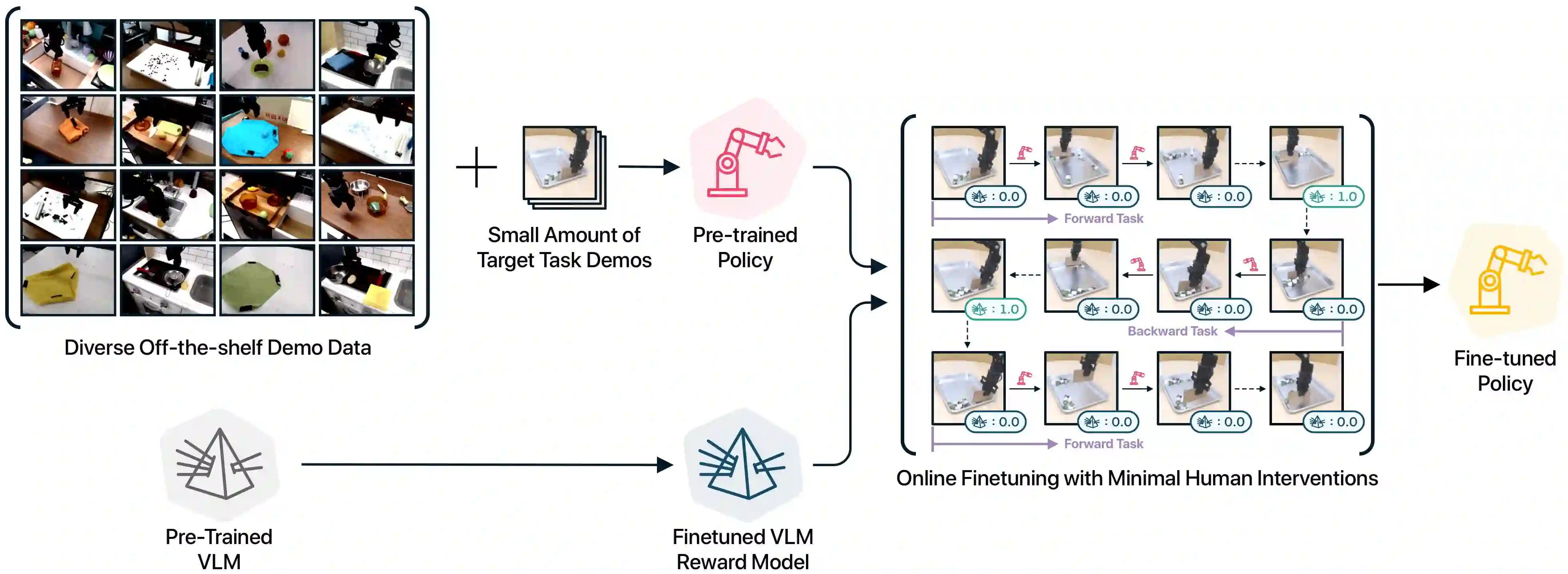 The pre-train and fine-tune paradigm in machine learning has had dramatic success in a wide range of domains because the use of existing data or pre-trained models on the internet enables quick and easy learning of new tasks. We aim to enable this paradigm in robotic reinforcement learning, allowing a robot to learn a new task with little human effort by leveraging data and models from the Internet. However, reinforcement learning often requires significant human effort in the form of manual reward specification or environment resets, even if the policy is pre-trained. We introduce RoboFuME, a reset-free fine-tuning system that pre-trains a multi-task manipulation policy from diverse datasets of prior experiences and self-improves online to learn a target task with minimal human intervention. Our insights are to utilize calibrated offline reinforcement learning techniques to ensure efficient online fine-tuning of a pre-trained policy in the presence of distribution shifts and leverage pre-trained vision language models (VLMs) to build a robust reward classifier for autonomously providing reward signals during the online fine-tuning process. In a diverse set of five real robot manipulation tasks, we show that our method can incorporate data from an existing robot dataset collected at a different institution and improve on a target task within as little as 3 hours of autonomous real-world experience. We also demonstrate in simulation experiments that our method outperforms prior works that use different RL algorithms or different approaches for predicting rewards. Project website: https://robofume.github.io