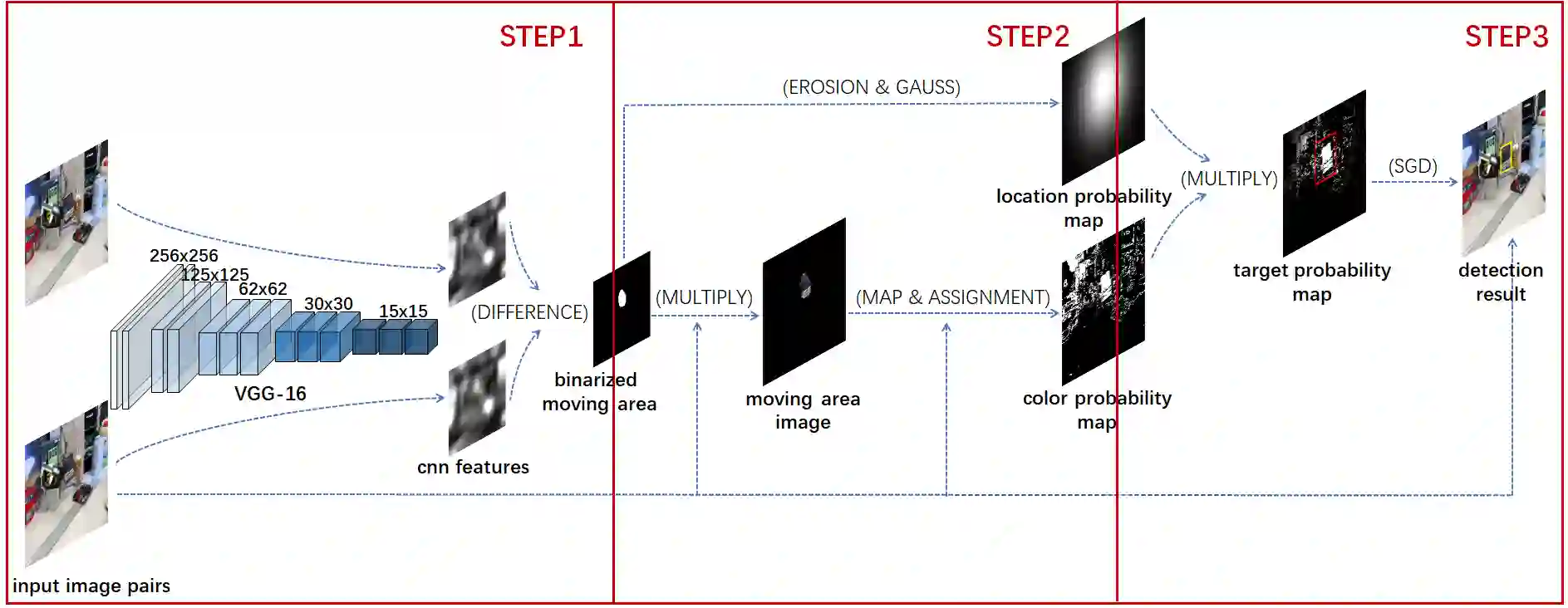 翻译:移动目标检测在计算机视觉中起着重要作用。 然而, 框架差异和光学流等传统算法通常会受到低精度或重度计算的影响。 最近的算法, 如深学习的进化神经网络, 已经实现了高精度和实时性能, 但是它们通常需要事先知道目标的类别, 从而限制实际应用。 因此, 我们提议了一个模型自由移动目标检测算法。 这个算法通过图像特征的差别来提取移动区域。 然后, 移动区域的颜色和位置概率地图将会通过最大的事后概率来计算。 目标概率地图可以通过两个地图之间的点乘法获得。 最后, 最佳移动目标区域可以通过目标概率地图上的随机梯度梯度梯度梯度梯度梯度梯度梯度梯度梯度梯度梯度梯度梯度来解决。 结果显示, 拟议的算法可以达到与最新水平的算法相比的最高精度, 而不需要知道目标的等级。 此外, 由于现有的数据集不适合移动目标检测, 我们提议了一种方法。 此外, 我们还证明拟议的算法可以用来帮助目标跟踪。