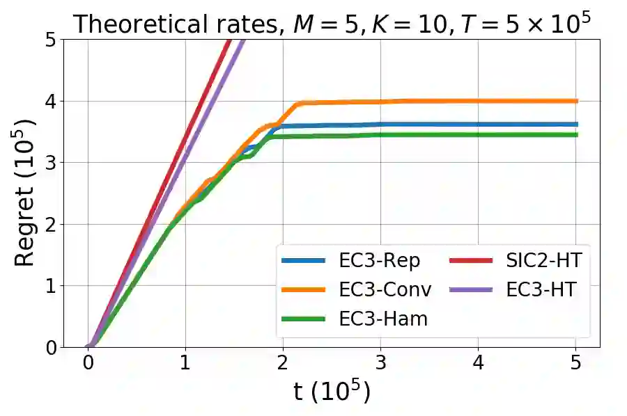翻译:我们研究的是一个新的多玩家多臂强盗问题(MP-MAB),如果手臂发生碰撞,奖励分配就会发生变化。现有的文献总是假定在碰撞发生时对所涉玩家给予零奖励,但对于认知收音机等应用来说,更现实的情景是碰撞会减少平均奖励,但不一定是零。我们侧重于更实际的无观测环境,让玩家不直接看到碰撞,并提出错误校正协调通信(EC3)算法,模型将通信隐含为可靠的通信,而不是吵闹的频道问题,为此,随机编码错误会被用来证明任何通信协议都无法战胜的最佳遗憾。最后,优化代码长度与解码错误率之间的权衡,导致遗憾接近中央MP-MAB的遗憾,这代表了自然下限。在合成和真实世界数据集上实际错误校正代码的实验显示了EC3的优势。特别是,结果显示,编码计划的选择对后悔表现产生了深远的影响。