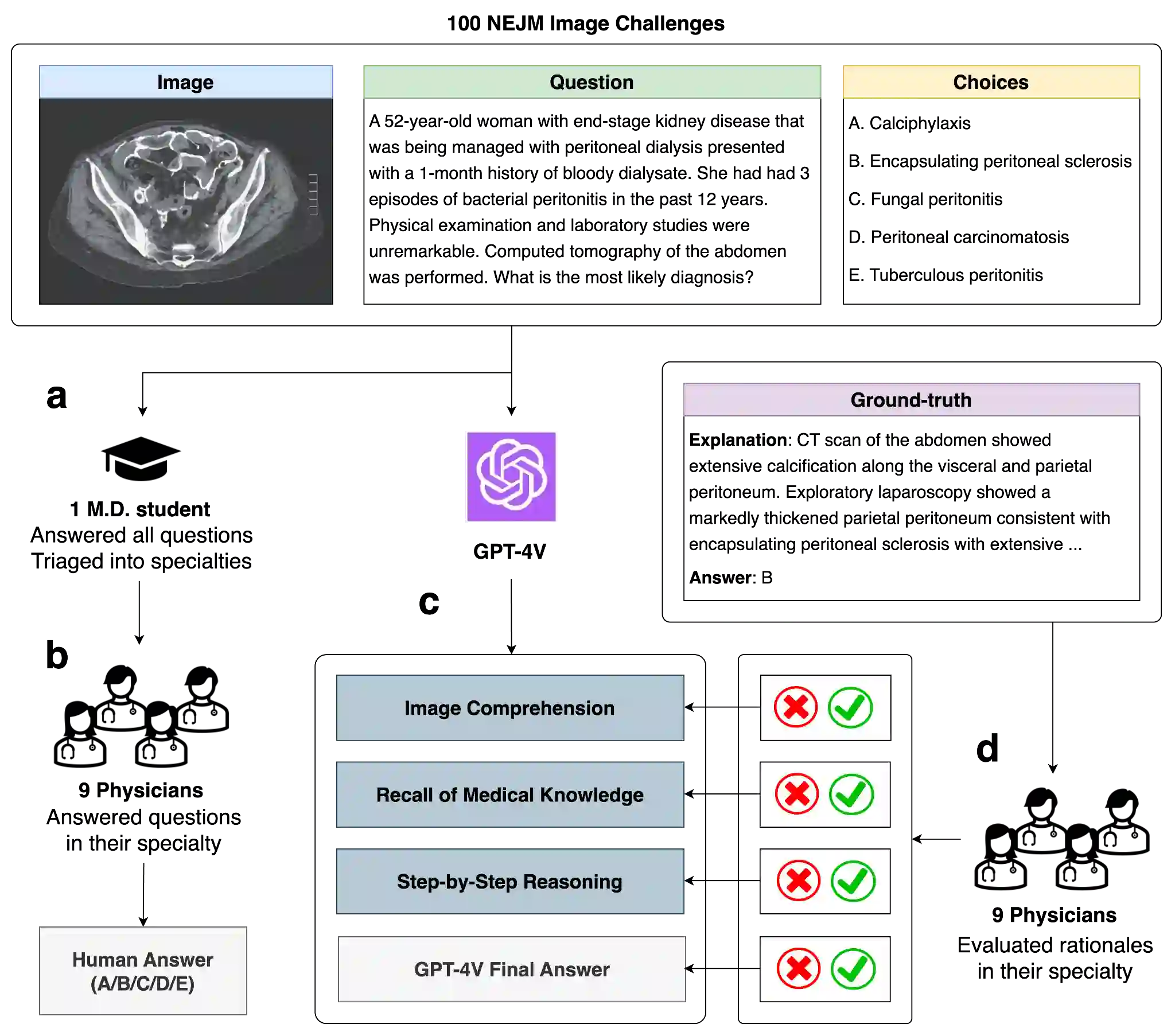 Recent studies indicate that Generative Pre-trained Transformer 4 with Vision (GPT-4V) outperforms human physicians in medical challenge tasks. However, these evaluations primarily focused on the accuracy of multi-choice questions alone. Our study extends the current scope by conducting a comprehensive analysis of GPT-4V's rationales of image comprehension, recall of medical knowledge, and step-by-step multimodal reasoning when solving New England Journal of Medicine (NEJM) Image Challenges - an imaging quiz designed to test the knowledge and diagnostic capabilities of medical professionals. Evaluation results confirmed that GPT-4V outperforms human physicians regarding multi-choice accuracy (88.0% vs. 77.0%, p=0.034). GPT-4V also performs well in cases where physicians incorrectly answer, with over 80% accuracy. However, we discovered that GPT-4V frequently presents flawed rationales in cases where it makes the correct final choices (27.3%), most prominent in image comprehension (21.6%). Regardless of GPT-4V's high accuracy in multi-choice questions, our findings emphasize the necessity for further in-depth evaluations of its rationales before integrating such models into clinical workflows.