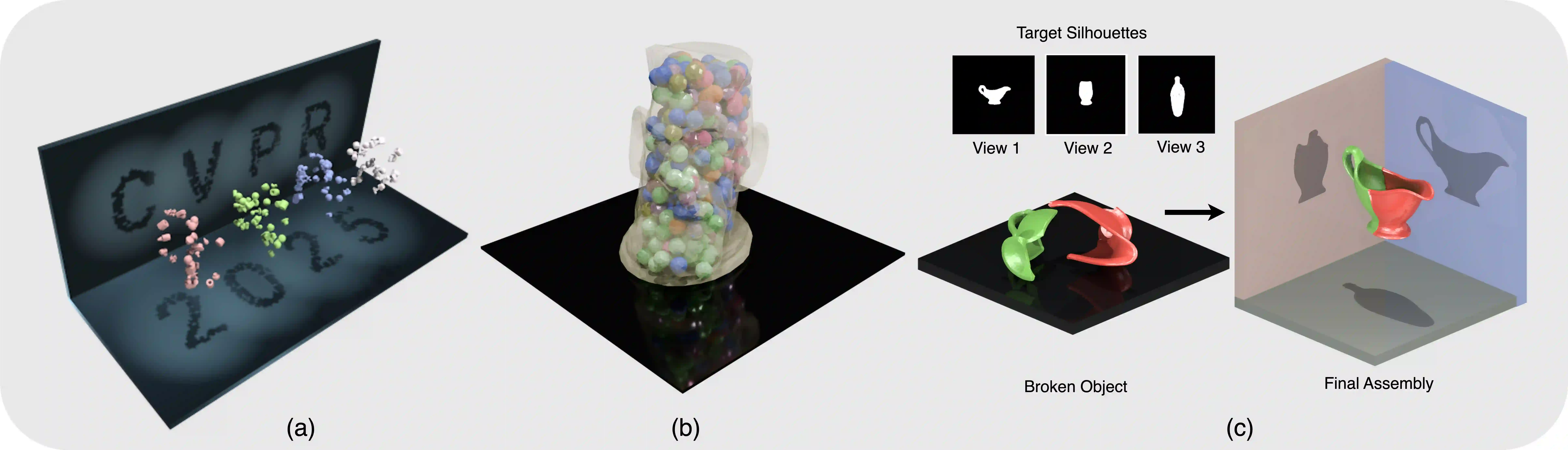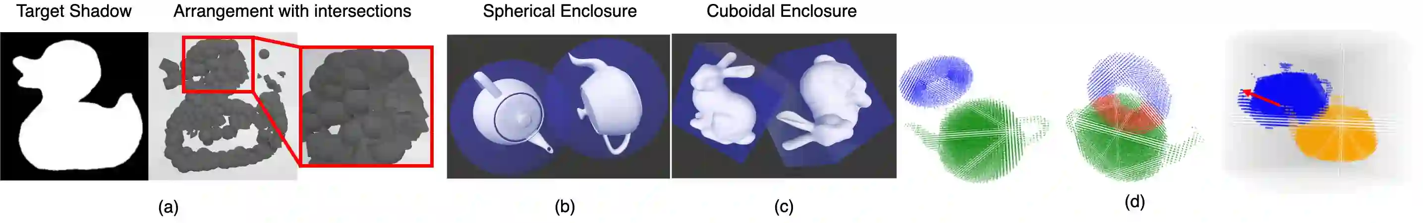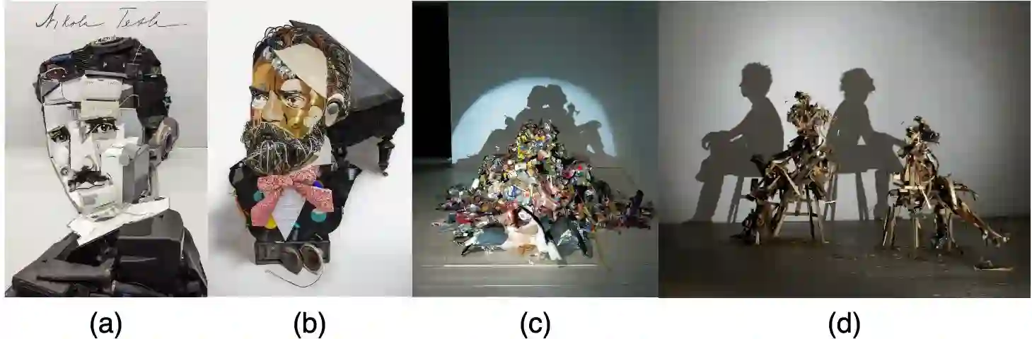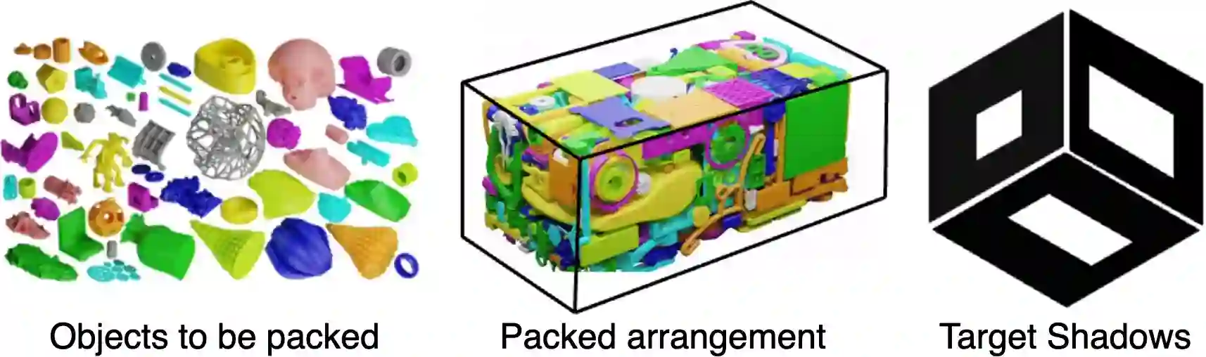 翻译:近年来,基于学习的方法为通过计算模型探索和阐释艺术形式(如阴影艺术、折纸艺术和素描艺术)开辟了新途径。其中一种值得关注的视觉艺术形式是3维变形艺术,即一组任意形状的3D物体在特定观察视角下会呈现逼真且有意义的表达,而在其他视角下则失去其视觉连贯性。本研究基于3维变形艺术的原理,提出一种3D物体排列方法。我们引入RASP框架,该框架基于可微分渲染技术,通过阴影(或轮廓)引导的优化方法,在有限容积内排列任意形状的3D物体,以实现最小化物体间距与接近最大化的空间占用率。此外,我们提出一种新颖的基于SDF的数学表述来处理物体间交叉与容器外溢问题。实验证明,RASP可扩展至部件装配与物体堆叠场景,此时3D物体被视为另一3D物体的“部件”。最后,我们展示了多视角变形艺术的艺术图示,在单一组合体中实现了多视角下的有意义视觉表达。