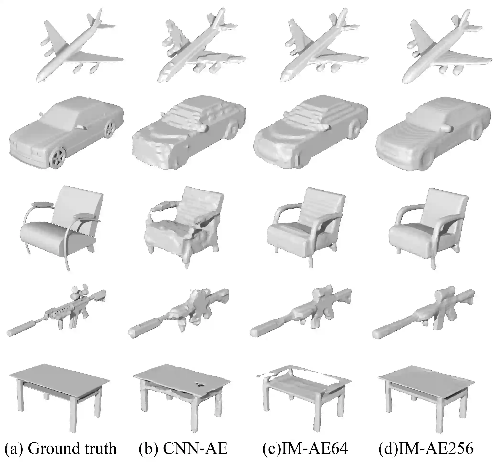 翻译:我们主张使用隐含字段来学习形状的基因模型,并为形状生成引入一个隐含的字段解码器,目的是提高生成形状的视觉质量。一个隐含字段为3D空间的每个点指定了值,以便能够将形状作为异表提取。我们隐含的字段解码器受过培训,能够通过二元分类器完成这一任务。具体地说,它需要一个点坐标,加上一个特性矢量编码一个形状,并输出一个值,表明该点是否在形状之外。我们用我们的解码器替换传统的解码器,用于代表学习和形状的基因建模,我们通过对形状自动编码、生成、内插和单视3D重建等任务展示优异的结果,特别是在视觉质量方面。