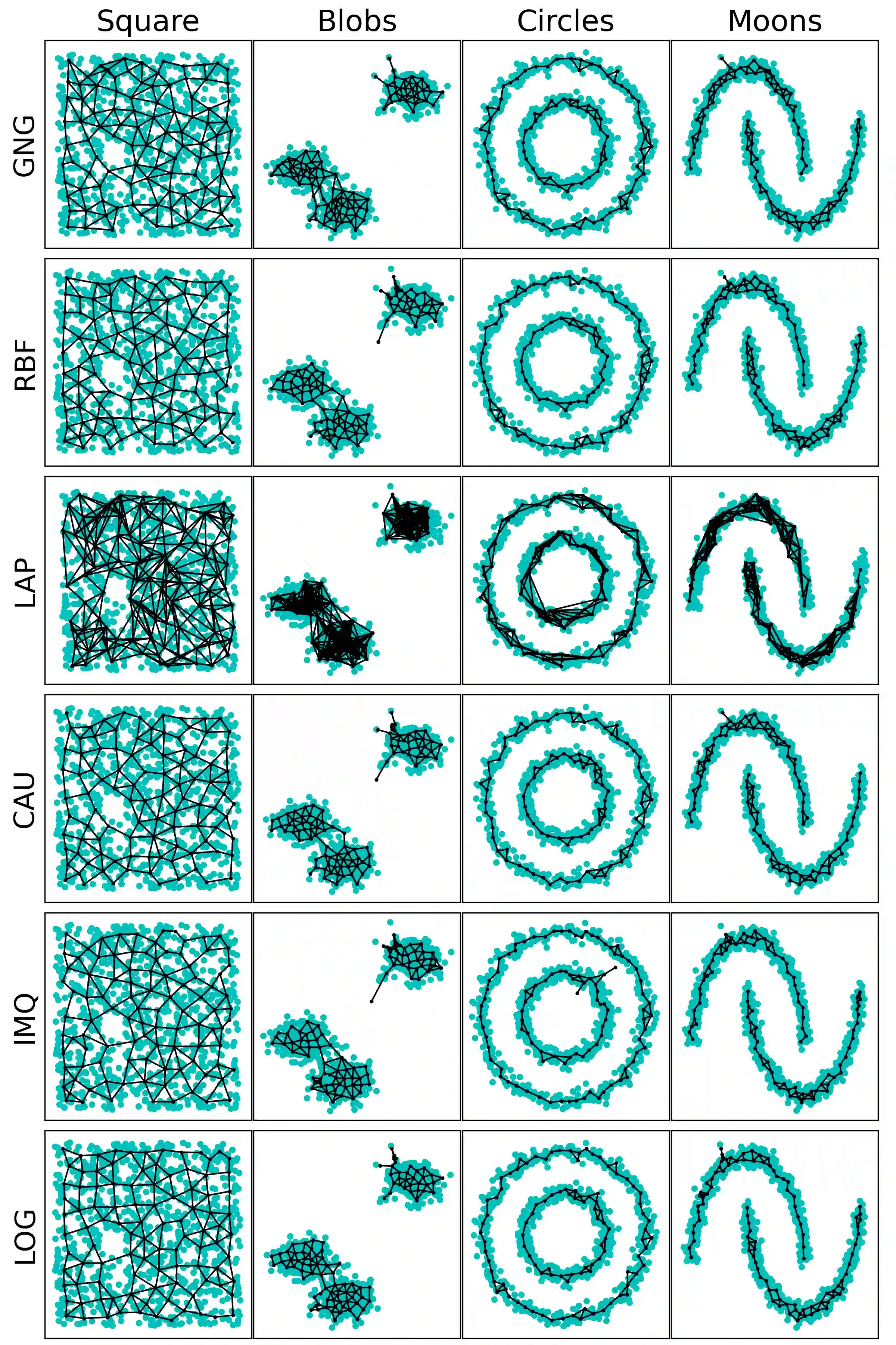 This research aims to develop kernel GNG, a kernelized version of the growing neural gas (GNG) algorithm, and to investigate the features of the networks generated by the kernel GNG. The GNG is an unsupervised artificial neural network that can transform a dataset into an undirected graph, thereby extracting the features of the dataset as a graph. The GNG is widely used in vector quantization, clustering, and 3D graphics. Kernel methods are often used to map a dataset to feature space, with support vector machines being the most prominent application. This paper introduces the kernel GNG approach and explores the characteristics of the networks generated by kernel GNG. Five kernels, including Gaussian, Laplacian, Cauchy, inverse multiquadric, and log kernels, are used in this study. The results of this study show that the average degree and the average clustering coefficient decrease as the kernel parameter increases for Gaussian, Laplacian, Cauchy, and IMQ kernels. If we avoid more edges and a higher clustering coefficient (or more triangles), the kernel GNG with a larger value of the parameter will be more appropriate.