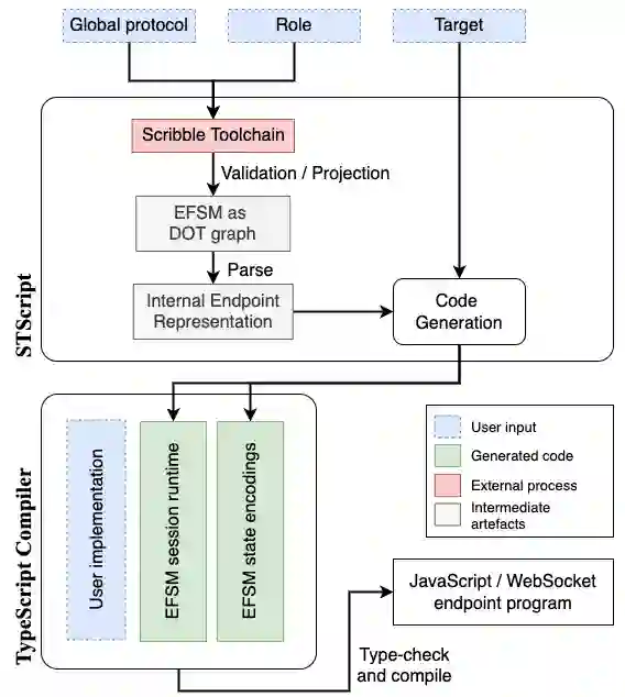 翻译:通常,基于网络的分布式系统的互动以非正式的方式描述,使得很难确保正确性,特别是通信安全,即所有端点在不出现类型错误或僵局的情况下都进步,符合指定的协议。我们介绍了STScript,这是一个生成TypeScript API 用于在WebSockets上进行通信安全网络开发的工具链,以及RouST,这是一个支持多层次与路由机制沟通的新会话类型理论。STScript向开发者提供了基于 RouST 的通信协议规格生成的TypeScript APIs。生成的APIs以TypeScript condality 做法为基础,补充了全斯塔克网络开发中由事件驱动的编程风格,并与Node.js运行服务器端端端端点的网络安全开发时间和Ract.js 浏览端端端点的React.js框架兼容。RouST可以通过中间参与者表达多党际互动方式。它支持浏览端端端端端端端端端端端的通信端端端通信端通信端通信用户之间的通信通信通信通信,通过服务器安全端端端应用程序进行我们端端端研究,通过网络安全端端端端端端的网络安全端的网络安全性评估。