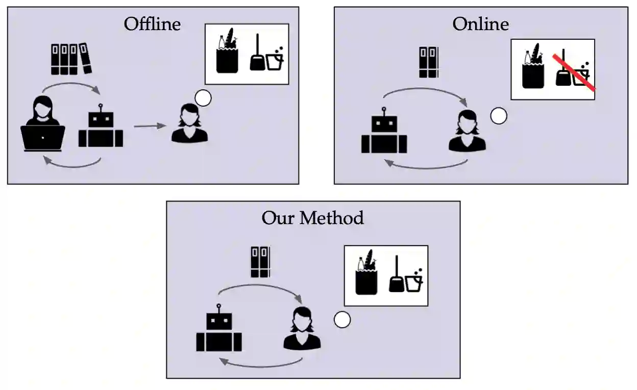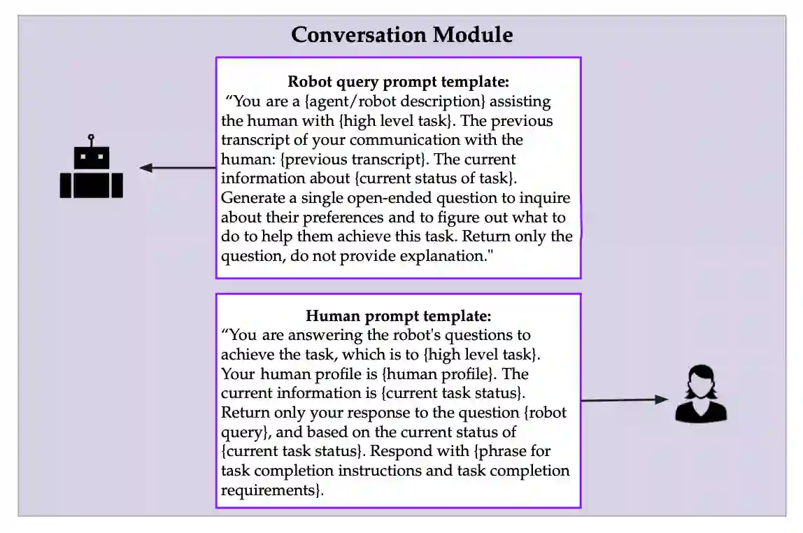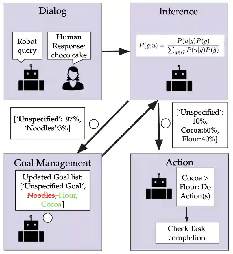 翻译:具身人工智能代理正迅速成为社会中重要且普遍的工具。这些具身代理应能高效且稳健地学习和完成用户广泛的目标与偏好。大型语言模型常被采用,因其支持人与代理之间通过丰富开放的对话式交互,根据人类偏好完成任务。本论文主张,对于在任务协助中处理开放式对话的具身代理:1)人工智能代理应以自然语言形式从对话中提取目标,以更好地捕捉人类偏好,因为人类通过自然语言向代理传达任务偏好是直观的。2)人工智能代理应对这些目标进行量化/维持不确定性,以确保行动仅基于代理高度确信的目标执行。我们提出了一种在线方法,使具身代理能够学习并完成多样化的用户目标。尽管离线方法(如RLHF)能表征多种目标但需要大规模数据集,我们的方法以在线效率实现了类似的灵活性。我们利用大型语言模型从对话中提取自然语言目标表征。我们提示大型语言模型扮演具有不同目标的人类角色,并利用相应的似然度对潜在目标进行贝叶斯推断。因此,我们的方法能够基于无限制对话表征复杂目标的不确定性。我们在基于文本的杂货购物领域和AI2Thor机器人仿真中评估了该方法,并与缺乏显式目标表征或概率推断的消融基线进行了比较。