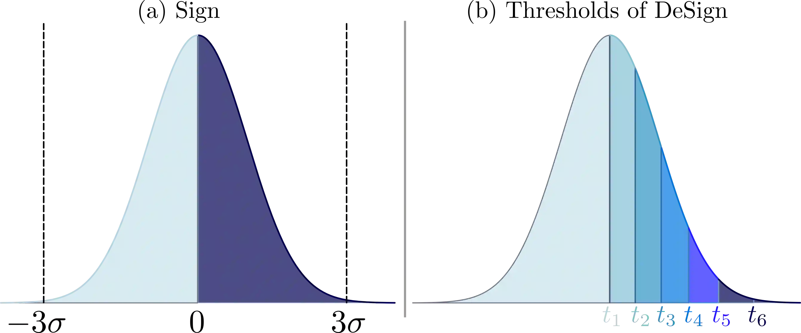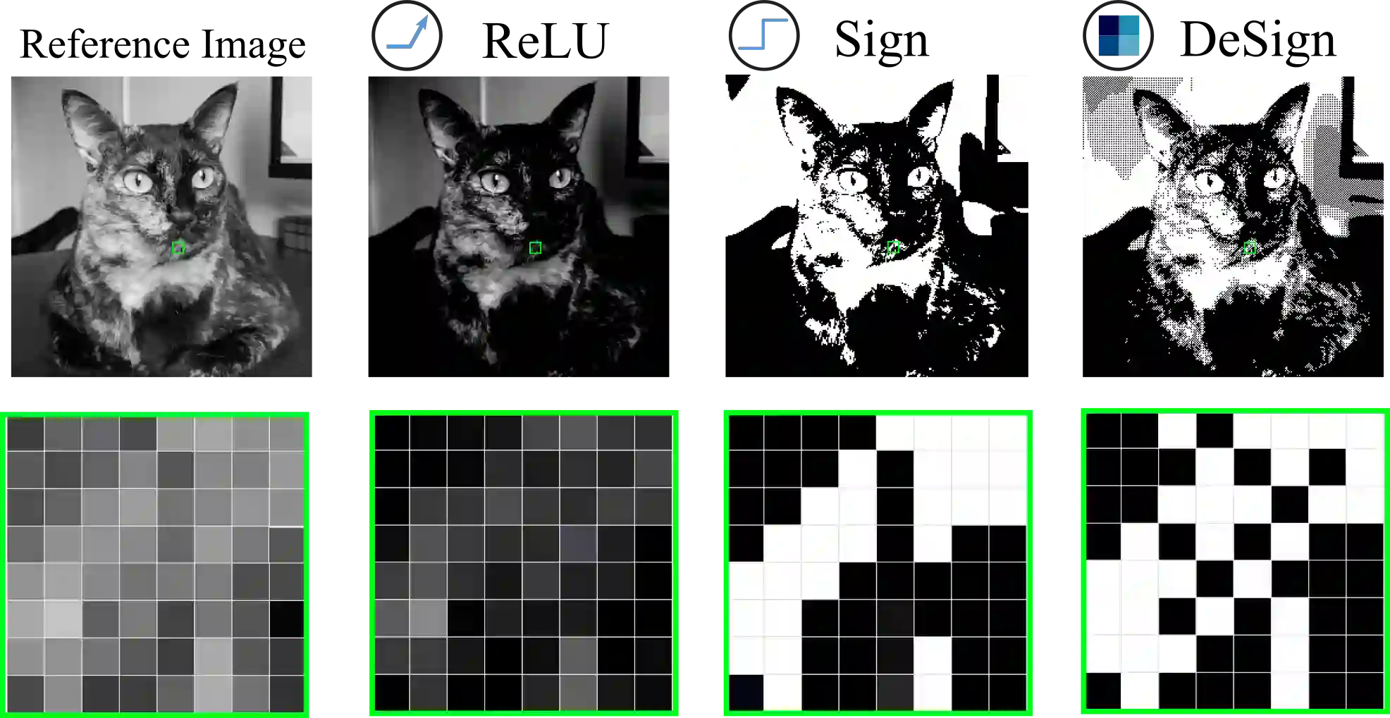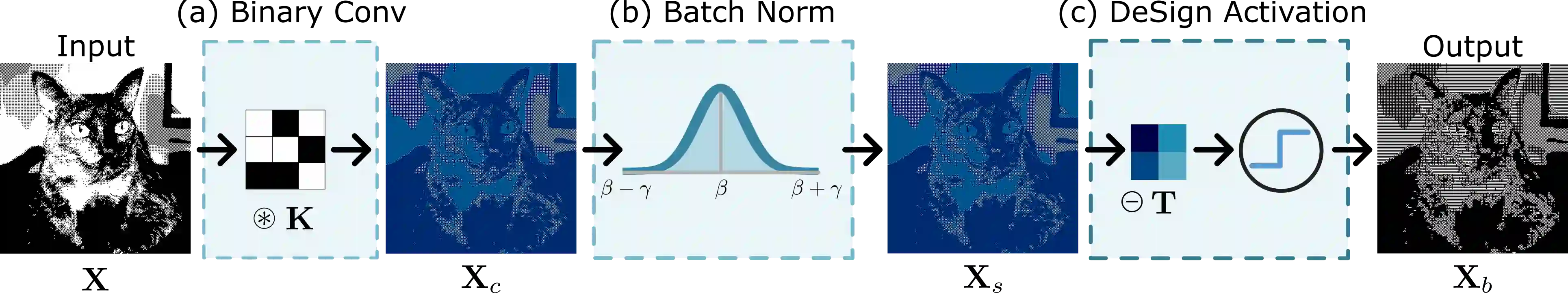 Binary Neural Networks emerged as a cost-effective and energy-efficient solution for computer vision tasks by binarizing either network weights or activations. However, common binary activations, such as the Sign activation function, abruptly binarize the values with a single threshold, losing fine-grained details in the feature outputs. This work proposes an activation that applies multiple thresholds following dithering principles, shifting the Sign activation function for each pixel according to a spatially periodic threshold kernel. Unlike literature methods, the shifting is defined jointly for a set of adjacent pixels, taking advantage of spatial correlations. Experiments over the classification task demonstrate the effectiveness of the designed dithering Sign activation function as an alternative activation for binary neural networks, without increasing the computational cost. Further, DeSign balances the preservation of details with the efficiency of binary operations.