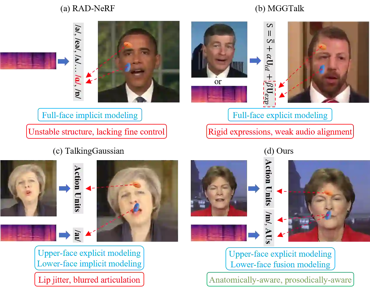 翻译:音频驱动的说话头视频生成增强了人机交互中的用户参与度。然而,现有方法常因依赖音频-面部运动关联的隐式建模——一种缺乏明确发音先验(即语音相关面部运动的解剖学指导)的方法——而产生运动模糊和唇部抖动的视频。为克服此局限,我们提出了HM-Talker,一种生成高保真、时序连贯说话头的新框架。HM-Talker利用结合隐式与显式运动线索的混合运动表征:显式线索采用解剖学定义的面部肌肉运动单元(AUs),与隐式特征协同以减少音素-视位错位。具体而言,我们的跨模态解缠模块(CMDM)从对齐视觉线索的音频输入中提取互补的隐式/显式运动特征并直接预测AUs。为降低显式特征中的身份依赖性偏差并增强跨主体泛化能力,我们引入了混合运动建模模块(HMMM)。该模块动态融合随机配对的隐式/显式特征,强制进行身份无关学习。这些组件共同实现了跨多样身份的鲁棒唇部同步,推动了个性化说话头合成的发展。大量实验证明,HM-Talker在视觉质量与唇部同步准确性上均优于当前最先进方法。