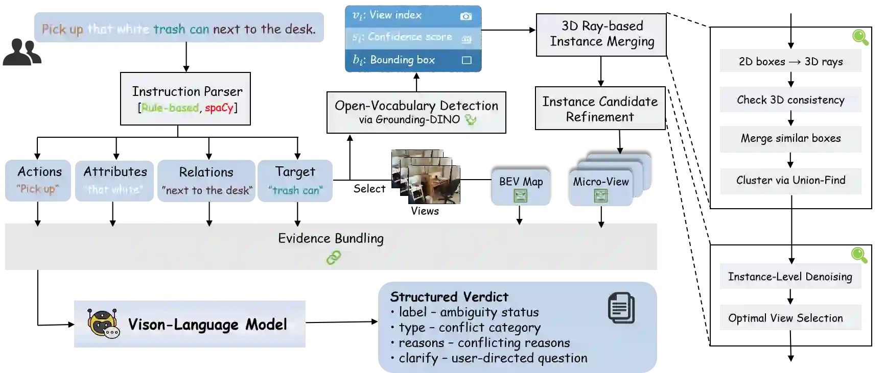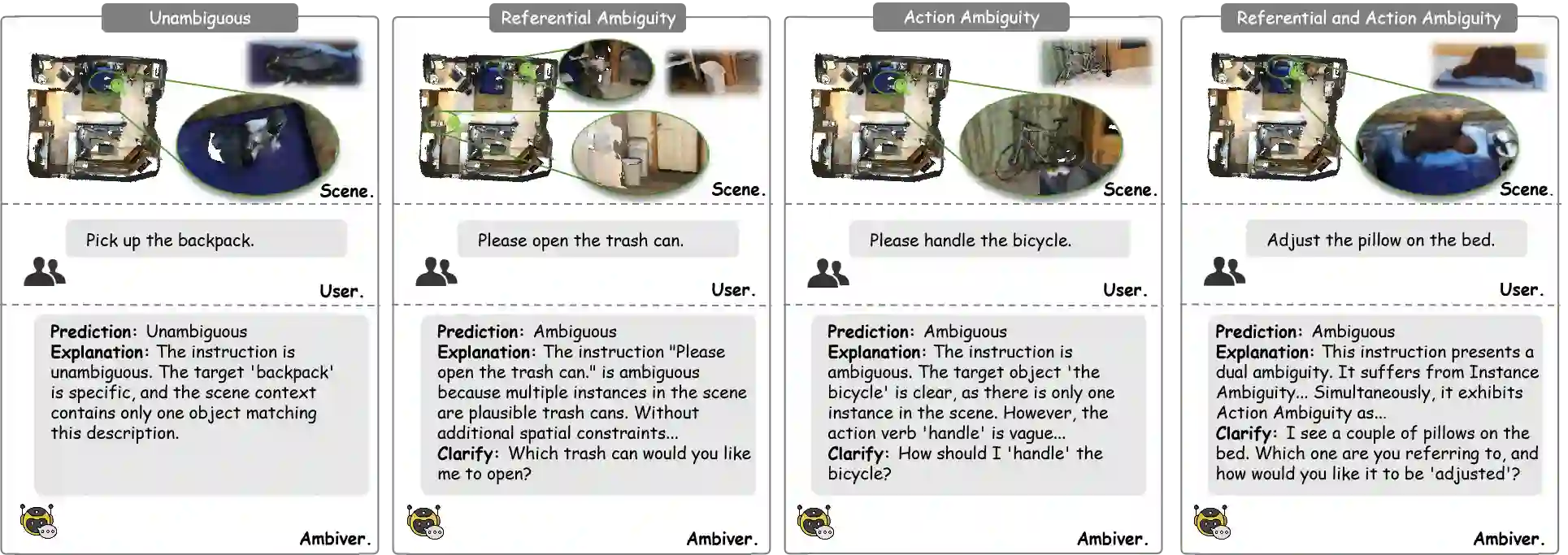 翻译:在安全关键领域,语言歧义可能引发严重后果;例如手术场景中"递给我那个小瓶"这类模糊指令可能导致灾难性错误。然而现有具身智能研究大多忽视此问题,默认指令清晰明确并聚焦于执行而非确认。为填补这一关键安全空白,我们首次定义了开放词汇三维指令歧义检测这一基础性新任务,要求模型判断给定三维场景中指令是否具有唯一明确含义。为支持相关研究,我们构建了该任务的大规模基准数据集Ambi3D,涵盖700余个多样化三维场景与约2.2万条指令。分析发现惊人局限:当前最先进的三维大语言模型难以可靠判断指令歧义性。针对此挑战,我们提出AmbiVer双阶段框架,通过多视角收集显式视觉证据,并引导视觉语言模型进行指令歧义判定。大量实验证实了本任务的挑战性及AmbiVer的有效性,为构建更安全可信的具身智能奠定基础。代码与数据集详见https://jiayuding031020.github.io/ambi3d/。