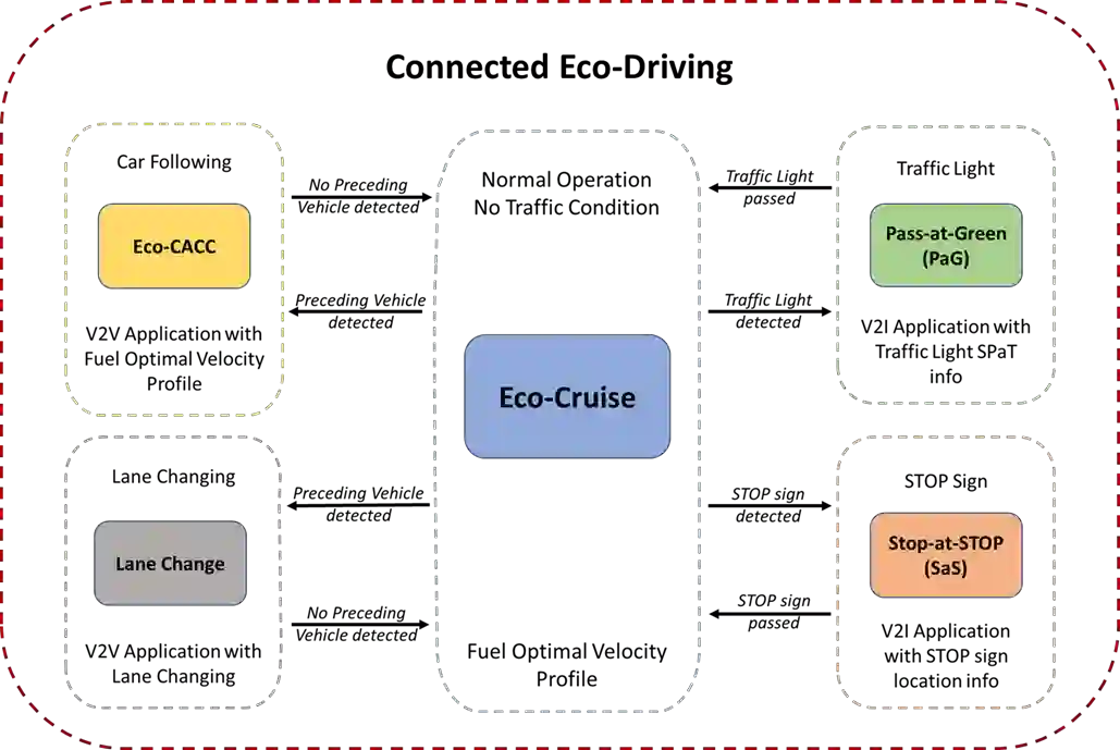 In this paper, a comprehensive Eco-Driving strategy for CAVs is presented. In this setup, multiple driving modes calculate speed profiles ideal for their own set of constraints simultaneously to save fuel as much as possible, while a High Level (HL) controller ensures smooth transitions between the driving modes for Eco-Driving. This Eco-Driving deterministic controller for an ego CAV was equipped with Vehicle-to-Infrastructure (V2I) and Vehicle-to-Vehicle (V2V) algorithms. Simulation results are used to show that the HL controller ensures significant fuel economy improvement as compared to baseline driving modes with no collisions between the ego CAV and traffic vehicles while the driving mode of the ego CAV was set correctly under changing constraints.