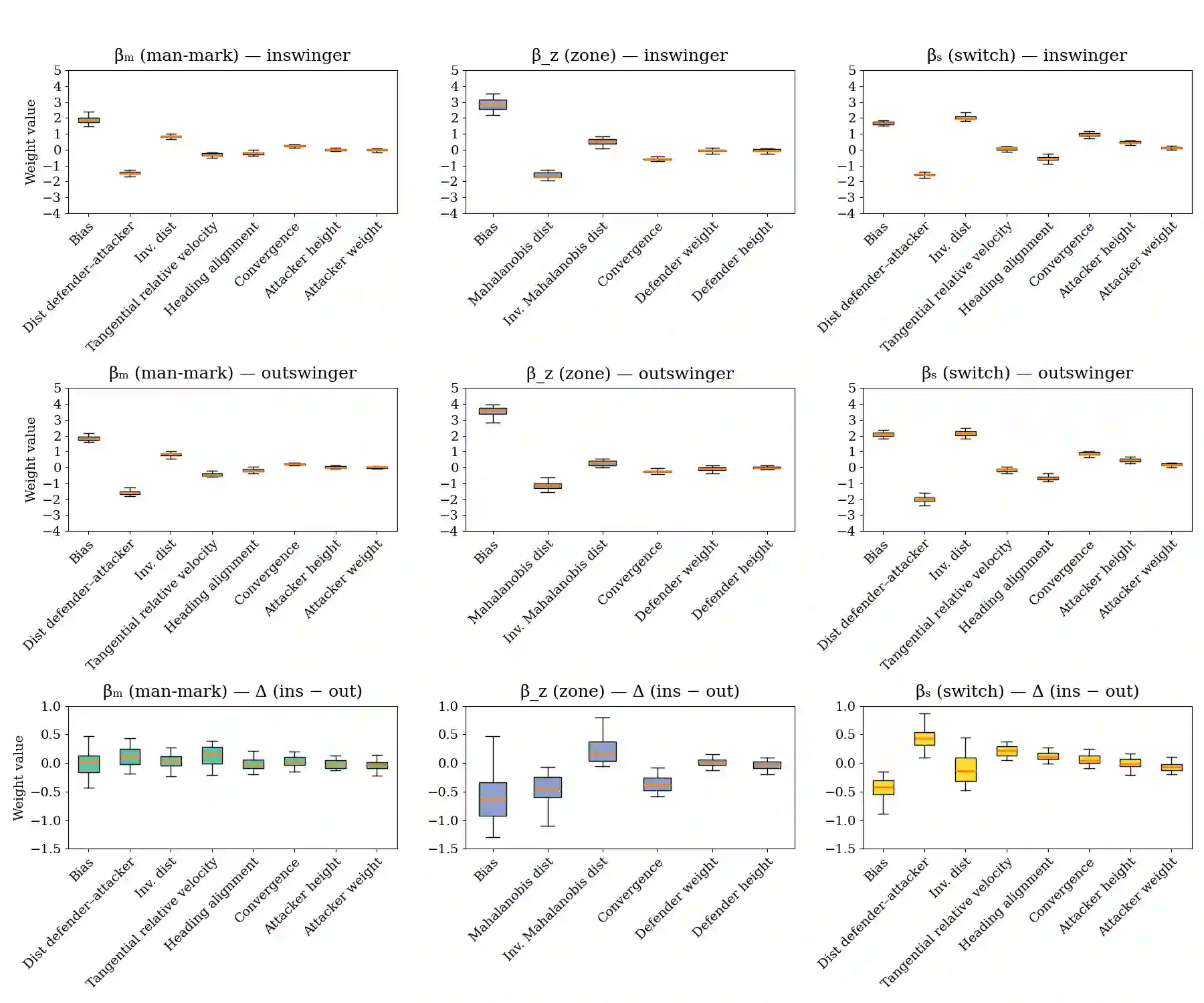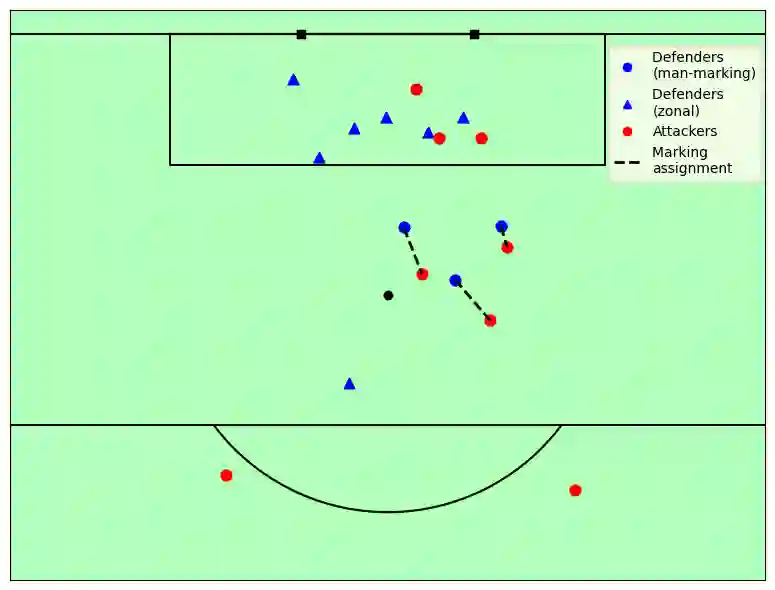 翻译:评估足球中的无球防守表现具有挑战性,因为传统指标无法捕捉那些限制对手行动选择和成功概率的微妙协调运动。尽管广泛使用的控球价值模型擅长评估有球行动,但其在防守方面的应用仍然有限。现有的反事实方法,如幻影模型,有助于扩展这些分析,但通常依赖于模拟缺乏战术背景的"平均"行为。为解决这一问题,我们引入了一种专为角球(足球比赛中高度结构化的环节)设计的协变量依赖隐马尔可夫模型。我们的无标签模型直接从球员追踪数据中推断出时间分辨的人盯人和区域防守任务分配。我们利用这些任务分配,提出了一种新颖的防守贡献归因框架,以及一种用于无球防守表现反事实分析的角色条件幻影方法。我们展示了这些贡献如何针对情境感知基线,提供可解释的防守贡献评估。