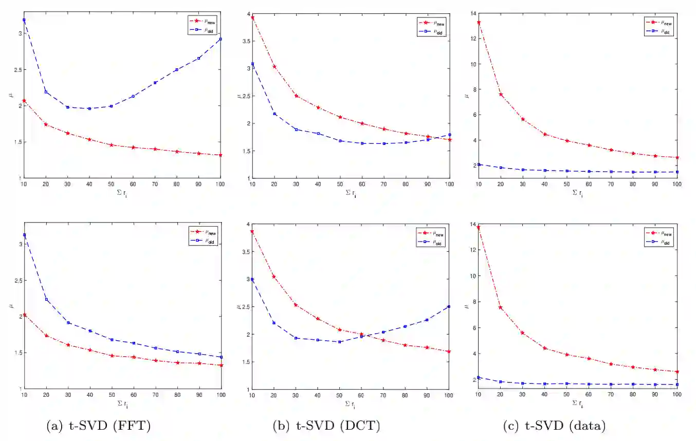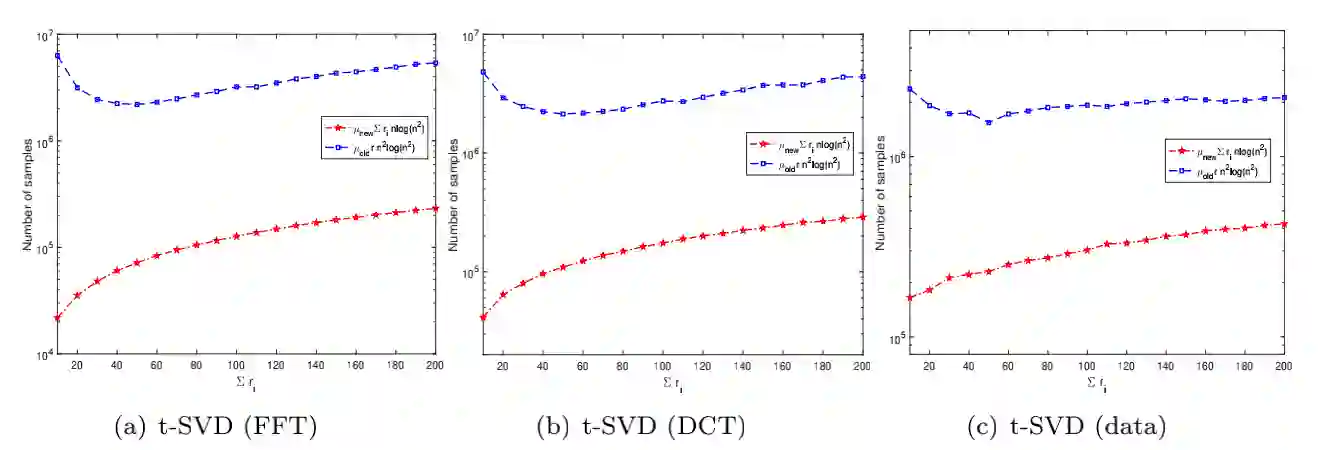 One of the key problems in tensor completion is the number of uniformly random sample entries required for recovery guarantee. The main aim of this paper is to study $n_1 \times n_2 \times n_3$ third-order tensor completion and investigate into incoherence conditions of $n_3$ low-rank $n_1$-by-$n_2$ matrix slices under the transformed tensor singular value decomposition where the unitary transformation is applied along $n_3$-dimension. We show that such low-rank tensors can be recovered exactly with high probability when the number of randomly observed entries is of order $O( r\max \{n_1, n_2 \} \log ( \max \{ n_1, n_2 \} n_3))$, where $r$ is the sum of the ranks of these $n_3$ matrix slices in the transformed tensor. By utilizing synthetic data and imaging data sets, we demonstrate that the theoretical result can be obtained under valid incoherence conditions, and the tensor completion performance of the proposed method is also better than that of existing methods in terms of sample sizes requirement.
