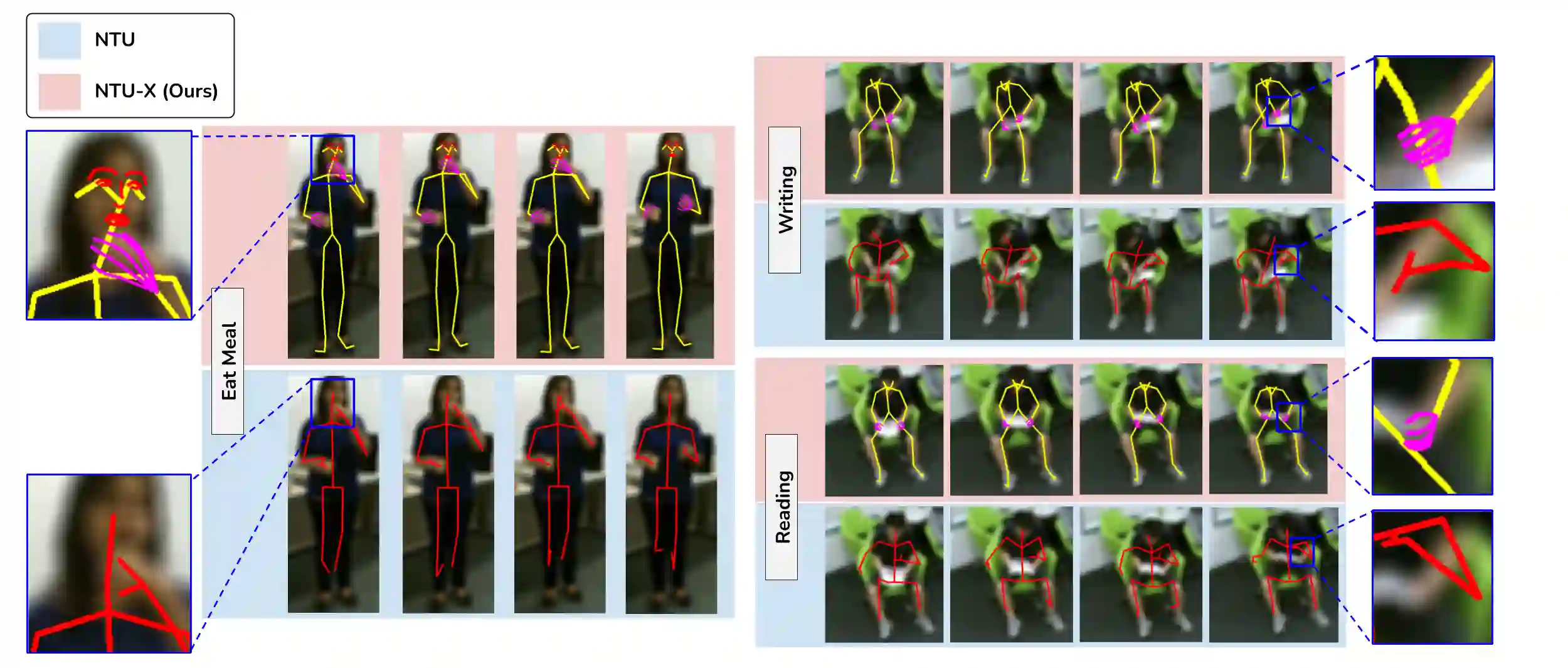 翻译:缺乏精细的关节(毛结、手手指)是状态最先进的骨骼行动识别模型的一个基本性能瓶颈。 尽管存在这种瓶颈,社区的努力似乎只投入到新结构中。为了具体解决这一瓶颈问题,我们引入了两个基于人类行动新构成的数据集:NTU60-X和NTU120-X。 我们的数据集扩展了现有最大的行动识别数据集NTU-RGBD。 除了NTU-RGBD、NTU60-X和NTU120-X中每个骨骼的25个机构连接外,还包括手指和面部连接,使得骨骼代表更加富有。我们适当修改艺术状态的方法,以便能够利用引入的数据集进行培训。我们的结果表明NTU-X数据集在克服上述瓶颈和改善总体和以往表现最差的行动类别方面的效力。