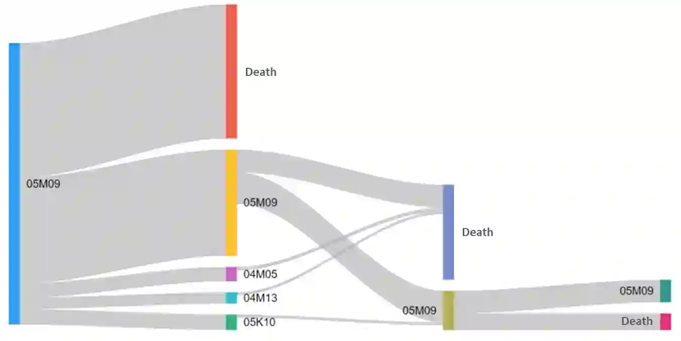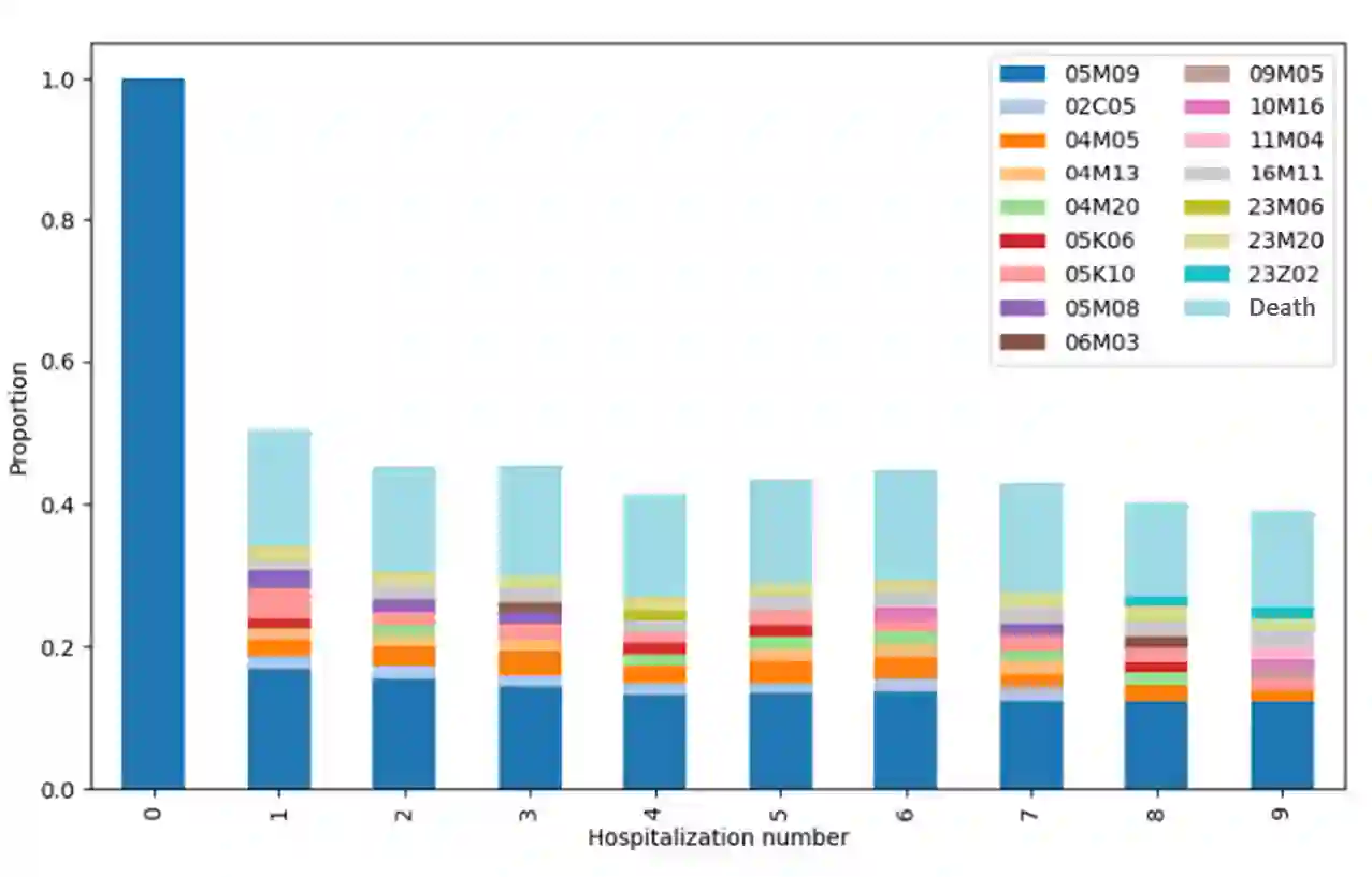Heart failure (HF) contributes to circa 200,000 annual hospitalizations in France. With the increasing age of HF patients, elucidating the specific causes of inpatient mortality became a public health problematic. We introduce a novel methodological framework designed to identify prevalent health trajectories and investigate their impact on death. The initial step involves applying sequential pattern mining to characterize patients' trajectories, followed by an unsupervised clustering algorithm based on a new metric for measuring the distance between hospitalization diagnoses. Finally, a survival analysis is conducted to assess survival outcomes. The application of this framework to HF patients from a representative sample of the French population demonstrates its methodological significance in enhancing the analysis of healthcare trajectories.