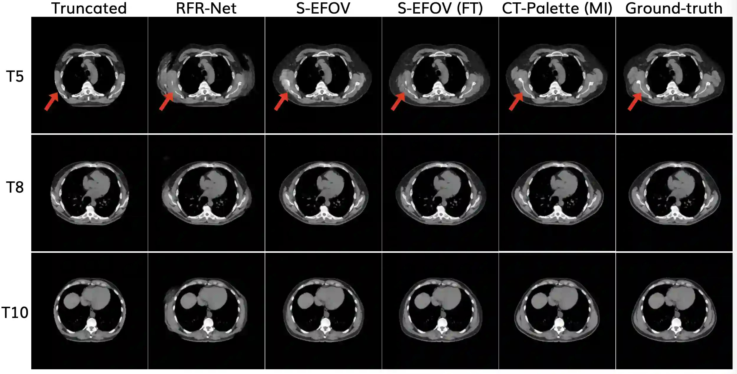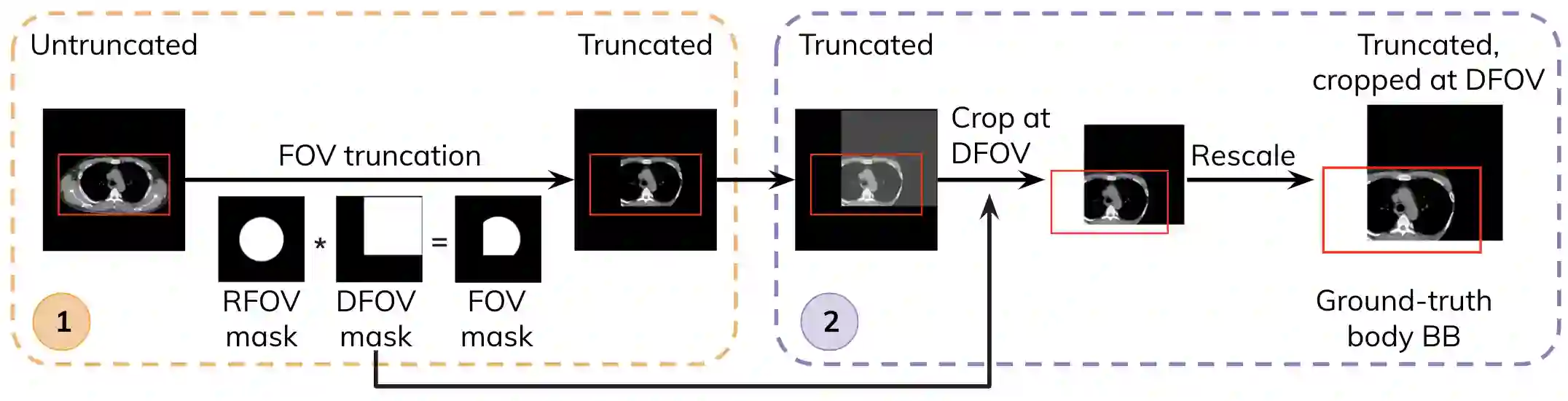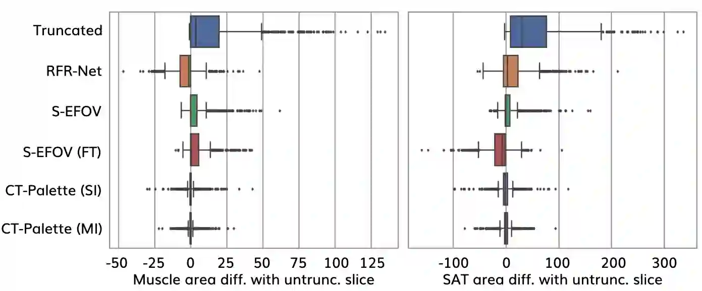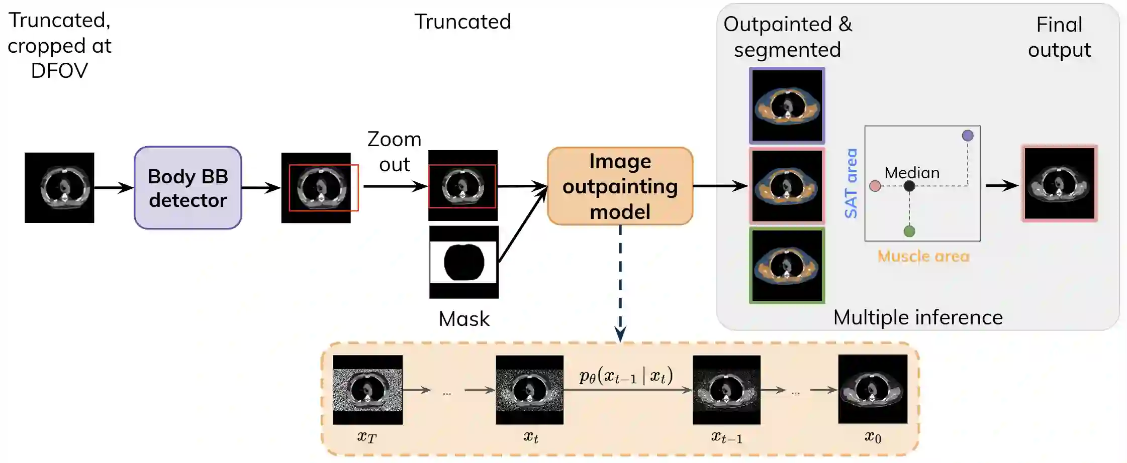 Field-of-view (FOV) recovery of truncated chest CT scans is crucial for accurate body composition analysis, which involves quantifying skeletal muscle and subcutaneous adipose tissue (SAT) on CT slices. This, in turn, enables disease prognostication. Here, we present a method for recovering truncated CT slices using generative image outpainting. We train a diffusion model and apply it to truncated CT slices generated by simulating a small FOV. Our model reliably recovers the truncated anatomy and outperforms the previous state-of-the-art despite being trained on 87% less data.