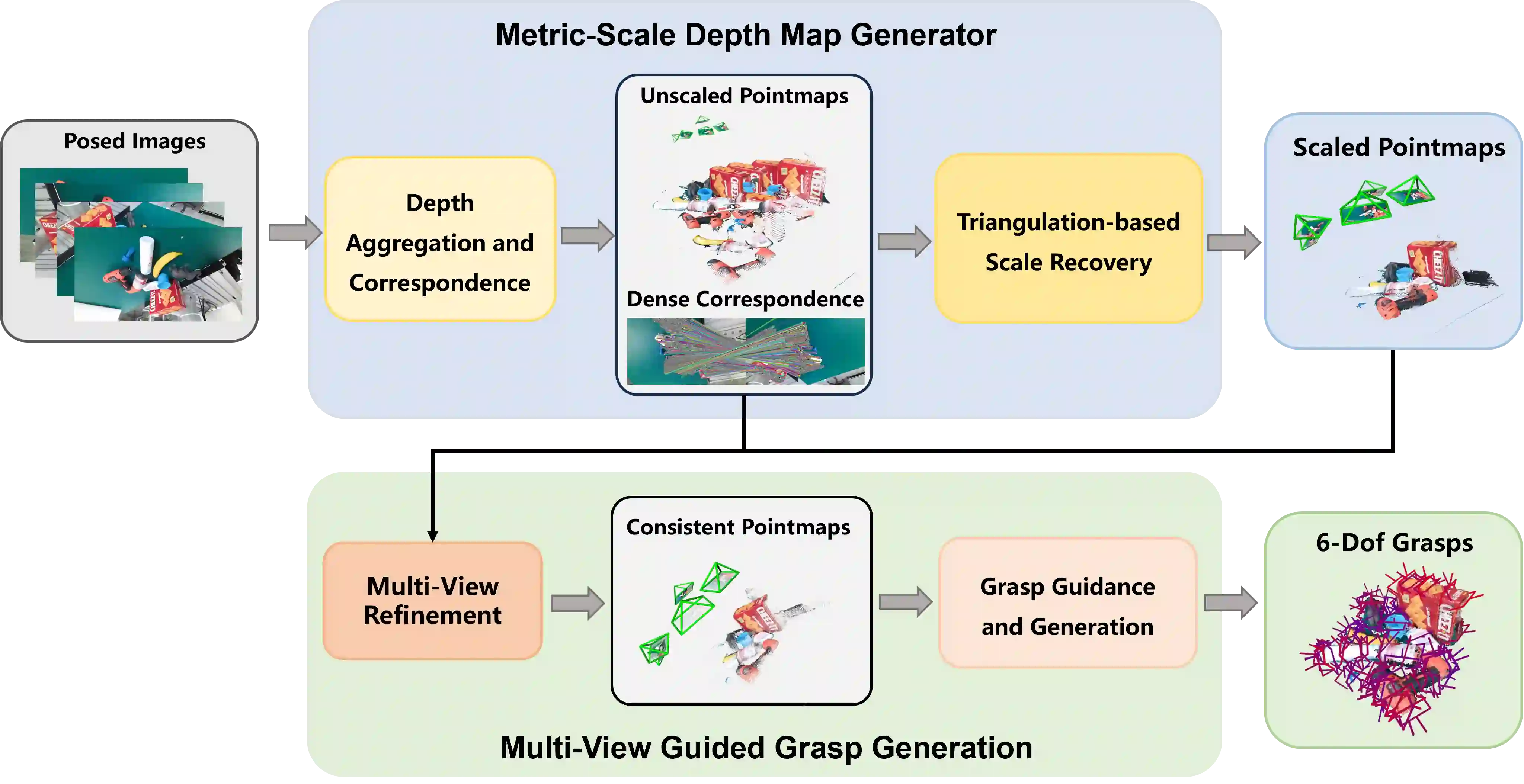 翻译:单视角RGB-D抓取检测仍是六自由度机器人抓取系统中的常见选择,其通常需要深度传感器。尽管近期已研究了仅使用RGB的六自由度抓取方法,但其不精确的几何表示并不直接适用于物理上可靠的机器人操作,从而阻碍了可靠抓取的生成。为应对这些局限,我们提出了MG-Grasp,一种新颖的无深度六自由度抓取框架,能够实现高质量物体抓取。通过利用具有相机内参/外参的双视角三维基础模型,我们的方法从稀疏RGB图像中重建度量尺度且多视角一致的稠密点云,并生成稳定的六自由度抓取。在GraspNet-1Billion数据集及真实场景上的实验表明,MG-Grasp在基于RGB的六自由度抓取方法中达到了最先进的抓取性能。