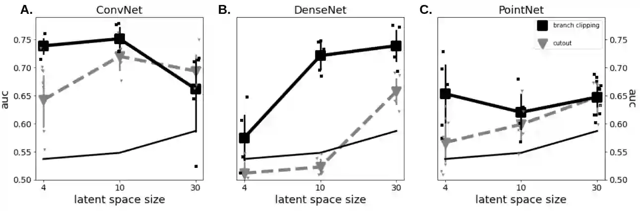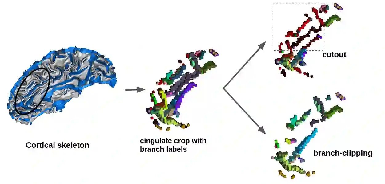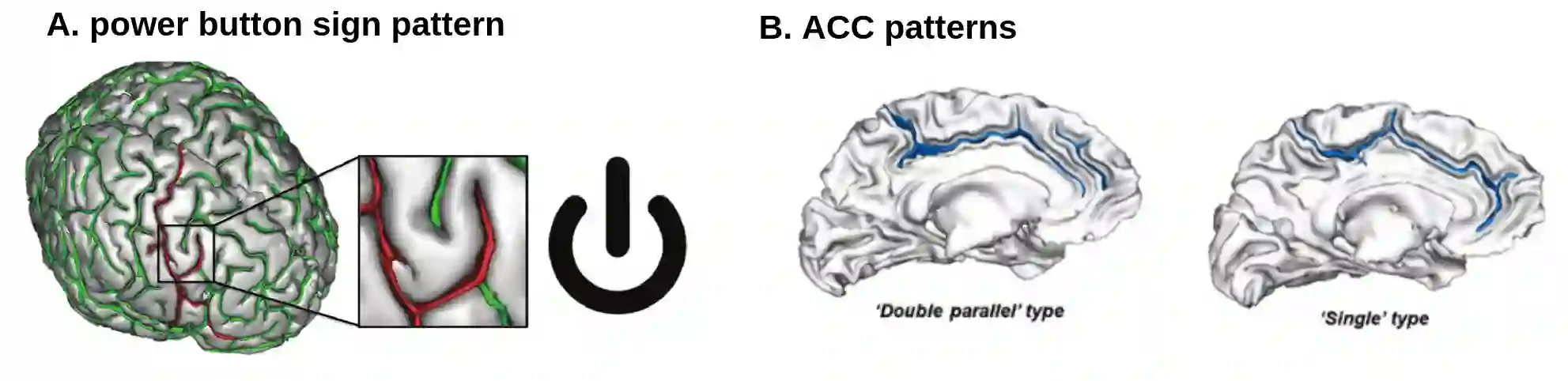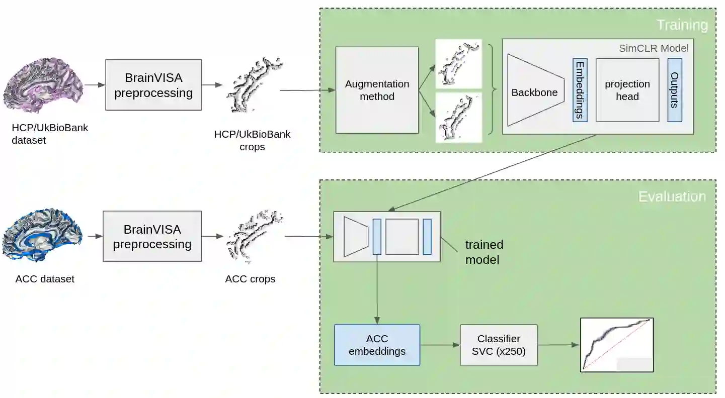 The human cerebral cortex has many bumps and grooves called gyri and sulci. Even though there is a high inter-individual consistency for the main cortical folds, this is not the case when we examine the exact shapes and details of the folding patterns. Because of this complexity, characterizing the cortical folding variability and relating them to subjects' behavioral characteristics or pathologies is still an open scientific problem. Classical approaches include labeling a few specific patterns, either manually or semi-automatically, based on geometric distances, but the recent availability of MRI image datasets of tens of thousands of subjects makes modern deep-learning techniques particularly attractive. Here, we build a self-supervised deep-learning model to detect folding patterns in the cingulate region. We train a contrastive self-supervised model (SimCLR) on both Human Connectome Project (1101 subjects) and UKBioBank (21070 subjects) datasets with topological-based augmentations on the cortical skeletons, which are topological objects that capture the shape of the folds. We explore several backbone architectures (convolutional network, DenseNet, and PointNet) for the SimCLR. For evaluation and testing, we perform a linear classification task on a database manually labeled for the presence of the "double-parallel" folding pattern in the cingulate region, which is related to schizophrenia characteristics. The best model, giving a test AUC of 0.76, is a convolutional network with 6 layers, a 10-dimensional latent space, a linear projection head, and using the branch-clipping augmentation. This is the first time that a self-supervised deep learning model has been applied to cortical skeletons on such a large dataset and quantitatively evaluated. We can now envisage the next step: applying it to other brain regions to detect other biomarkers.