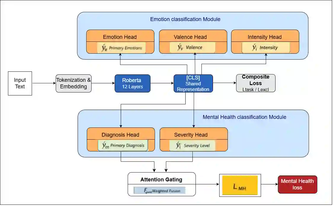 翻译:文本情感分类是自然语言处理领域最具挑战性的任务之一。当前最先进的方法依赖于大语言模型和多模型集成。本研究挑战了“提升性能必须依赖更大规模或更复杂模型”的假设。为提高逻辑一致性,我们提出了CMHL——一种新颖的单模型架构,通过三项关键创新显式建模情感的逻辑结构:(1) 联合预测基本情感、效价与强度的多任务学习;(2) 基于罗素环状模型的心理驱动辅助监督;(3) 新型对比矛盾损失函数,通过惩罚互不相容的预测(例如对喜悦与愤怒同时赋予高置信度)来强化情感一致性。仅使用1.25亿参数,我们的模型在dair-ai Emotion数据集上以93.75%的F1分数(对比基线86.13%-93.2%)超越了参数量56倍的大语言模型与小语言模型集成,创造了新的最优性能。我们进一步在Reddit自杀监控与心理健康数据集上展示了跨领域泛化能力:相比MentalBERT、MentalRoBERTa等领域专用模型,以72.50%的F1分数(对比68.16%-72.16%)和73.30%的召回率(对比67.05%-70.89%)实现超越,该召回率提升意味着对心理健康危机信号的检测敏感度显著增强。本研究表明:驱动文本情感分类进步的核心是架构智能(而非参数量)。通过嵌入心理学先验与显式一致性约束,一个精心设计的单模型能够超越庞杂的大语言模型与复杂集成系统,为情感计算提供高效、可解释且具临床实用价值的新范式。