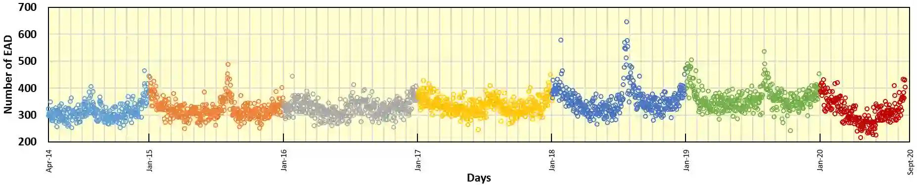 翻译:准确预测医疗服务需求是一个重要的大数据问题,对于自然灾害和大流行病等关键时刻的资源管理至关重要。随着2019年冠状病毒疾病(COVID-19)的全球蔓延,人们对医疗系统处理医疗保健提供者日常工作突然变化的能力提出了若干关切。一个重大问题是管理大流行病期间的救护车调度和控制。为了帮助解决这一问题,我们首先分析日本名古屋市2014年4月至2020年8月的救护车发送数据记录。在大流行病期间,发现数据发生了重大变化,包括日本各地宣布的紧急状态。我们在本研究中提议了一个基于经常性神经网络的深层学习框架,以估计苏艾期间紧急救护车调度的数量。数据的整合包括环境因素、移动电话用户的本地化数据以及前期的EAD历史,从而为知识发现和更好的资源管理提供了一个总体框架。结果显示,拟议的培训数据组合可以有效地用于实时估算流行病等高度不确定时期的ADE需求。