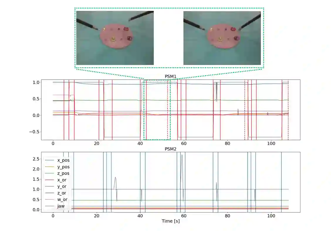 翻译:机械辅助手术是一种既定的临床实践。 需要自动识别外科手术行动, 其中包括对受训人员进行性能评估, 以及用于自主执行和监测的外科手术程序模型。 但是, 监督行动识别不可行, 原因是人工注解潜在复杂和长期外科手术处决记录的负担。 此外, 通常很少能记录执行外科手术程序的例子。 本文提议在标准外科培训任务、 环状转移、 与da Vinci Research Kit 一起执行的外科手术手术手术手术手术手术操作的未经监督识别的新算法。 开发从非常有限的处决数据集中自动提取的动能和语义直观特征, 我们能够大大超过类似应用的最新结果, 提高分数质量( 88% 相对于 82% 匹配分数) 和聚群( 67% 对54% F1- 分数), 即使存在噪音、 短动作和不均匀的工作流程, 即不重复行动序列 。 对于符合标准商业规格的硬件的全面行动识别, 以不到 1 s s 。