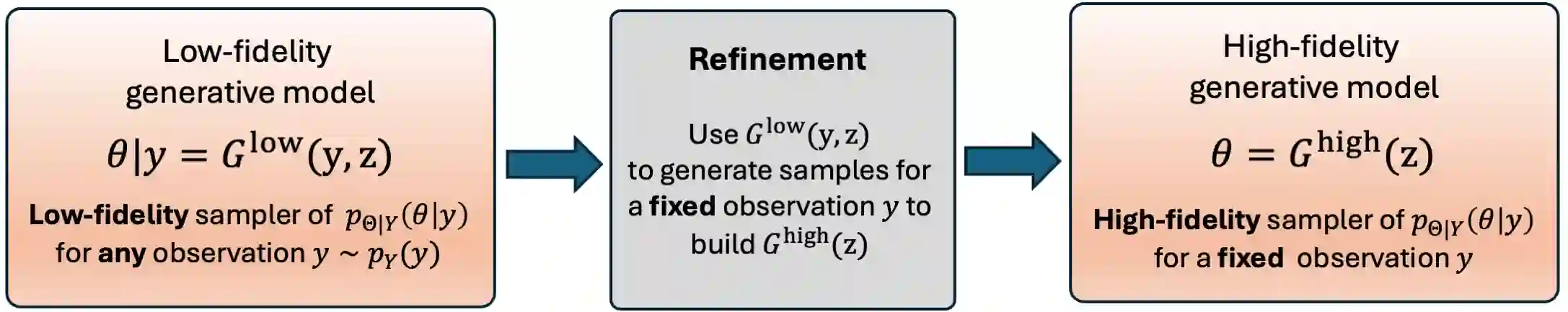 We present a multi-fidelity method for uncertainty quantification of parameter estimates in complex systems, leveraging generative models trained to sample the target conditional distribution. In the Bayesian inference setting, traditional parameter estimation methods rely on repeated simulations of potentially expensive forward models to determine the posterior distribution of the parameter values, which may result in computationally intractable workflows. Furthermore, methods such as Markov Chain Monte Carlo (MCMC) necessitate rerunning the entire algorithm for each new data observation, further increasing the computational burden. Hence, we propose a novel method for efficiently obtaining posterior distributions of parameter estimates for high-fidelity models given data observations of interest. The method first constructs a low-fidelity, conditional generative model capable of amortized Bayesian inference and hence rapid posterior density approximation over a wide-range of data observations. When higher accuracy is needed for a specific data observation, the method employs adaptive refinement of the density approximation. It uses outputs from the low-fidelity generative model to refine the parameter sampling space, ensuring efficient use of the computationally expensive high-fidelity solver. Subsequently, a high-fidelity, unconditional generative model is trained to achieve greater accuracy in the target posterior distribution. Both low- and high- fidelity generative models enable efficient sampling from the target posterior and do not require repeated simulation of the high-fidelity forward model. We demonstrate the effectiveness of the proposed method on several numerical examples, including cases with multi-modal densities, as well as an application in plasma physics for a runaway electron simulation model.