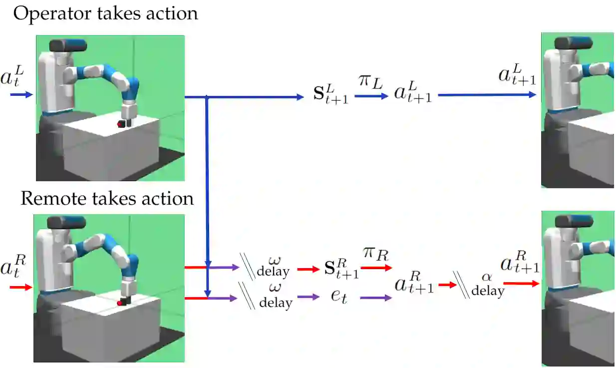 Local-remote systems allow robots to execute complex tasks in hazardous environments such as space and nuclear power stations. However, establishing accurate positional mapping between local and remote devices can be difficult due to time delays that can compromise system performance and stability. Enhancing the synchronicity and stability of local-remote systems is vital for enabling robots to interact with environments at greater distances and under highly challenging network conditions, including time delays. We introduce an adaptive control method employing reinforcement learning to tackle the time-delayed control problem. By adjusting controller parameters in real-time, this adaptive controller compensates for stochastic delays and improves synchronicity between local and remote robotic manipulators. To improve the adaptive PD controller's performance, we devise a model-based reinforcement learning approach that effectively incorporates multi-step delays into the learning framework. Utilizing this proposed technique, the local-remote system's performance is stabilized for stochastic communication time-delays of up to 290ms. Our results demonstrate that the suggested model-based reinforcement learning method surpasses the Soft-Actor Critic and augmented state Soft-Actor Critic techniques. Access the code at: https://github.com/CAV-Research-Lab/Predictive-Model-Delay-Correction
