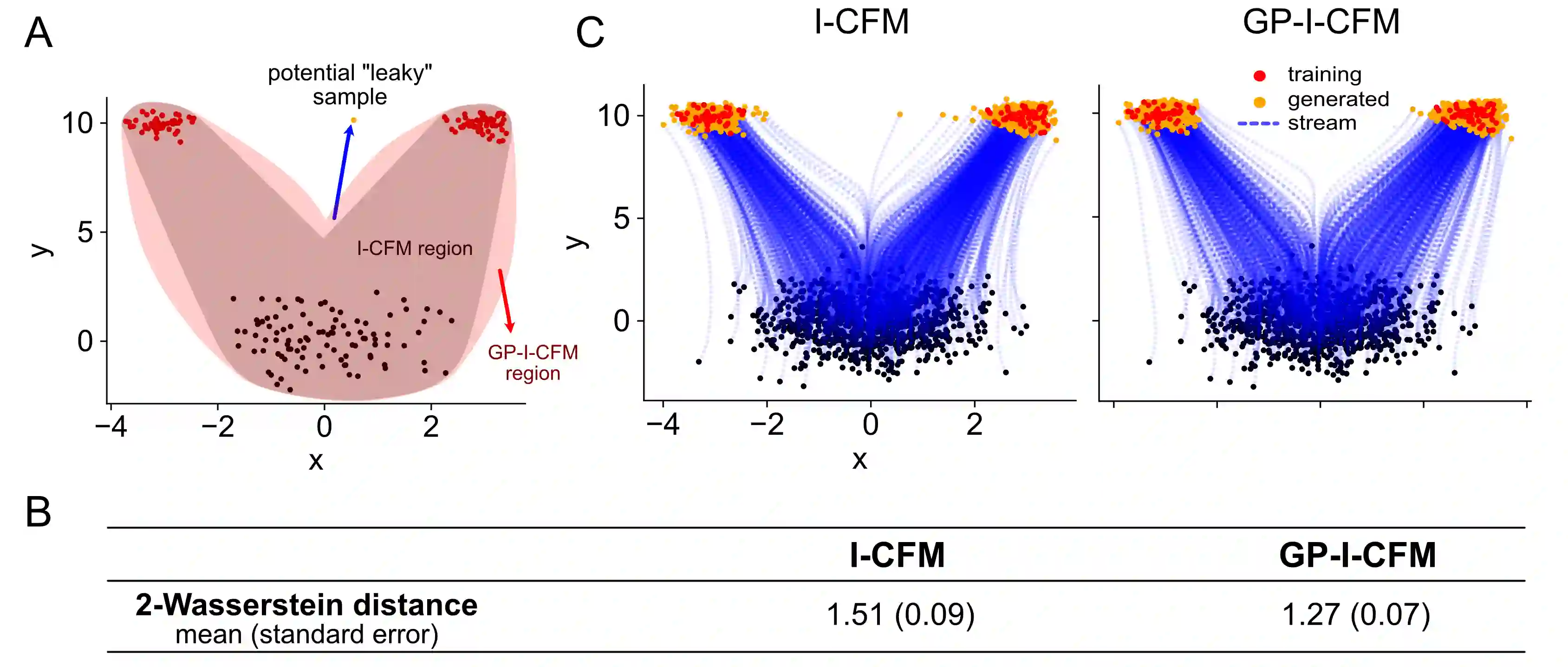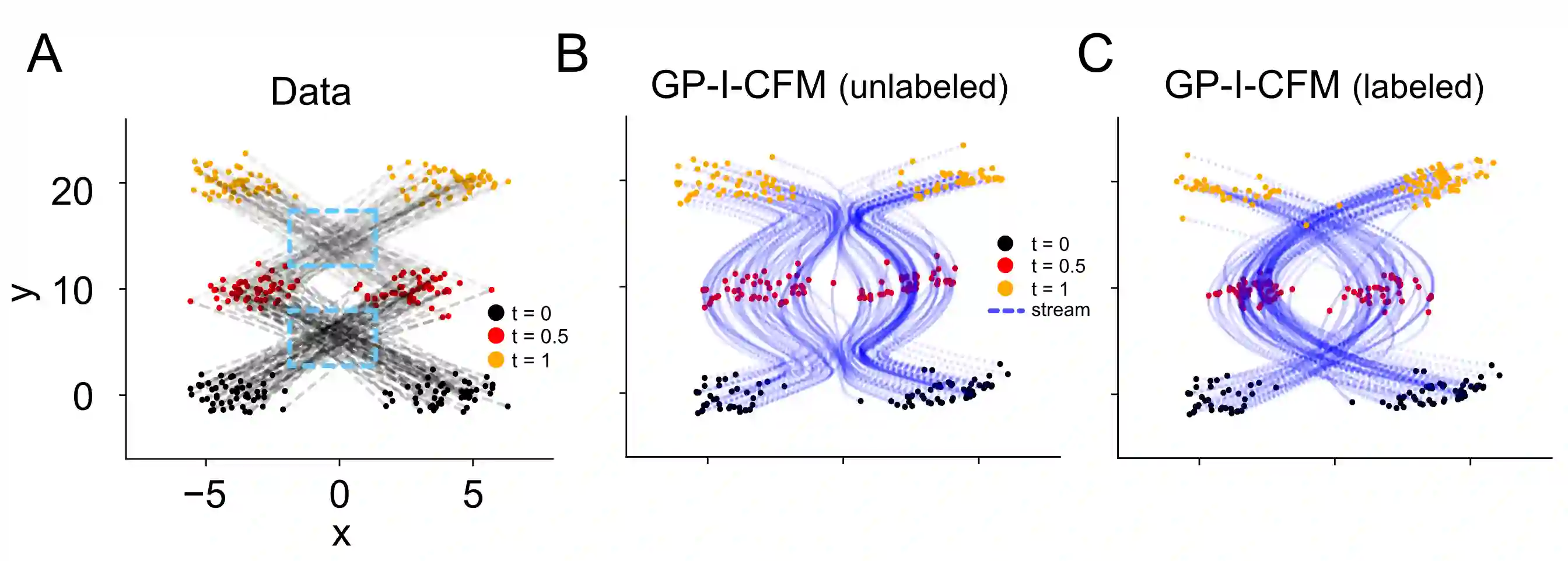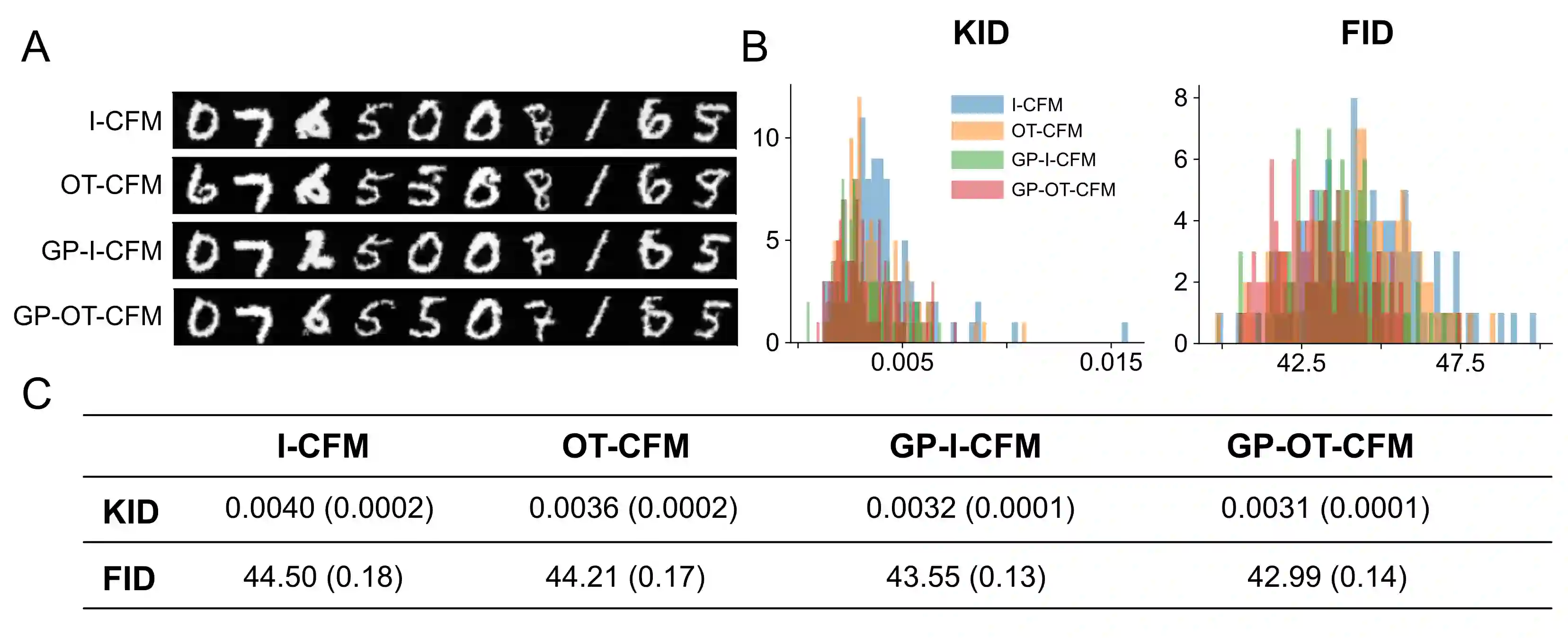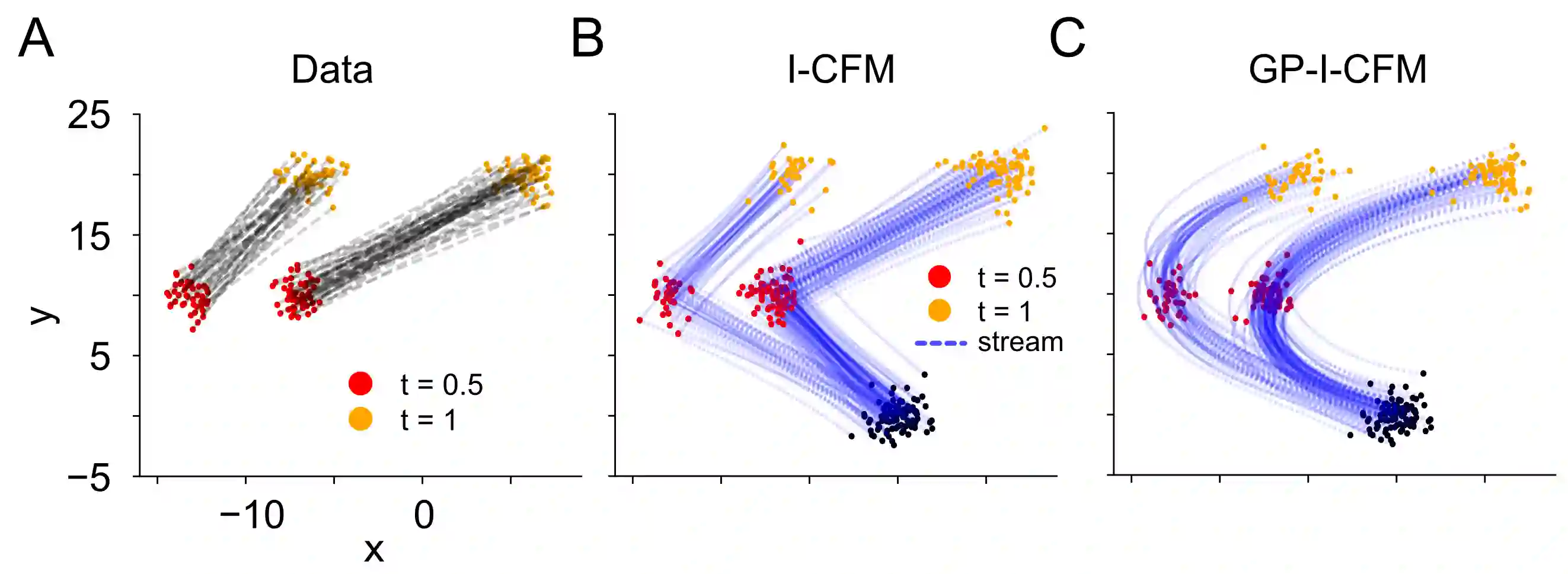 翻译:流匹配(FM)是一类用于拟合连续归一化流(CNF)的训练算法。一种称为条件流匹配(CFM)的标准FM方法,利用了CNF的边际向量场可以通过对给定流路径一端或两端所指定的所谓条件向量场进行最小二乘回归来学习的事实。我们证明,从贝叶斯决策理论视角看待CFM训练中的参数估计问题,为CFM算法的推广打开了大门。我们提出了一种此类扩展,通过引入一种基于定义条件概率路径的CFM算法,该路径给定我们称之为“流”的潜在随机路径实例,这些路径连接噪声与观测数据对。此外,我们主张使用高斯过程(GPs)对这些潜在流进行建模。GPs独特的分布特性,特别是GP的速度本身仍然是GP这一事实,允许从所得的流增强条件概率路径中抽取样本,而无需模拟实际的流,从而保留了CFM训练“免模拟”的特性。我们证明,这种CFM的推广能够以适中的计算成本显著降低估计边际向量场的方差,从而在常见度量下提高生成样本的质量。此外,我们表明,在流上采用GP允许灵活地关联多个相关的训练数据点(例如时间序列)并融入额外的先验信息。我们通过模拟实验以及应用于两个手写图像数据集,实证验证了我们的主张。