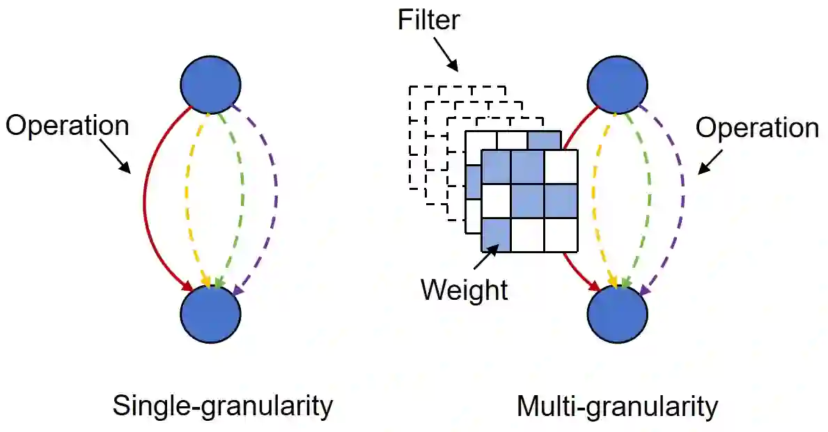 Differentiable architecture search (DAS) has become the prominent approach in the field of neural architecture search (NAS) due to its time-efficient automation of neural network design. It shifts the traditional paradigm of discrete architecture sampling and evaluation to differentiable super-net optimization and discretization. However, existing DAS methods either only conduct coarse-grained operation-level search, or restrictively explore fine-grained filter-level and weight-level units using manually-defined remaining ratios, which fail to simultaneously achieve small model size and satisfactory model performance. Additionally, they address the high memory consumption of the search process at the expense of search quality. To tackle these issues, we introduce multi-granularity architecture search (MGAS), a unified framework which aims to comprehensively and memory-efficiently explore the multi-granularity search space to discover both effective and efficient neural networks. Specifically, we learn discretization functions specific to each granularity level to adaptively determine the remaining ratios according to the evolving architecture. This ensures an optimal balance among units of different granularity levels for different target model sizes. Considering the memory demands, we break down the super-net optimization and discretization into multiple sub-net stages. By allowing re-pruning and regrowing of units in previous sub-nets during subsequent stages, we compensate for potential bias in earlier stages. Extensive experiments on CIFAR-10, CIFAR-100 and ImageNet demonstrate that MGAS outperforms other state-of-the-art methods in achieving a better trade-off between model performance and model size.